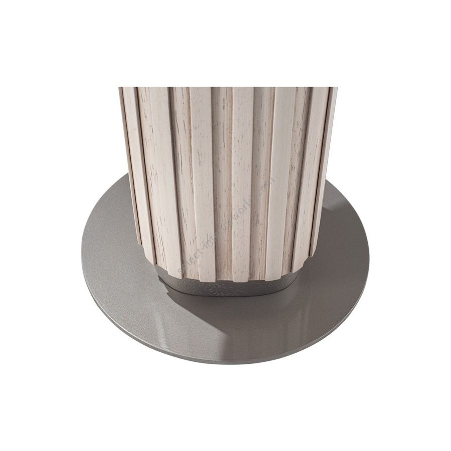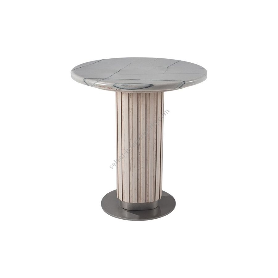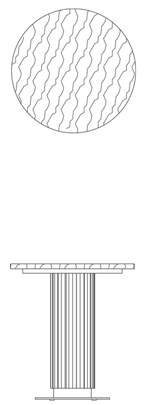 Die Steinplatte hat gerade Details, um ihre runde Form hervorzuheben. Der Sockel zeichnet sich durch sein geriffeltes Detail aus. Seine Form ist ein Quadrat mit abgerundeten Ecken, das auf einer runden Metallplatte ruht, die eine größere Stabilität und Widerstandsfähigkeit gegen Gewicht garantiert.