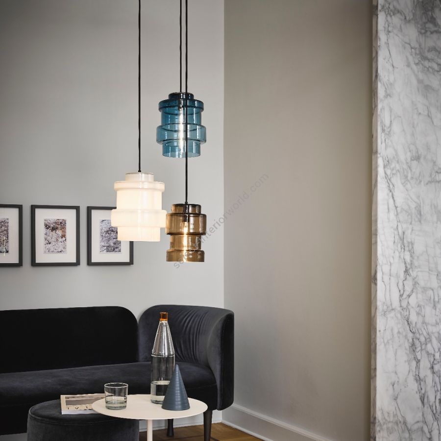 Alex de Witte has been designing with glass for a long period of time. Axle is the result of a study of breaking of light and layers. The design with different dimensions and layers of glass is both elegant and sturdy and in the meantime a familiar design. Axle can be used as a single pendant or Mix and Match in a chandelier of 3 and 5 pcs. The mouth blown glasses are available in 3 sizes in the colours Opal White, New Brown, Antique Green and Smoke Blue. The dimmable LED provides a warm and functional light.