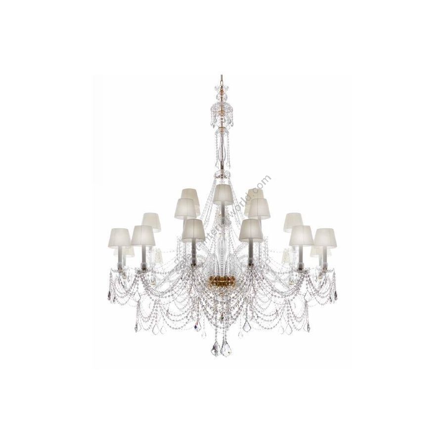 Kronleuchter mit 24 Lichtern aus klarem Glas mit Dekorationen aus Kristall und Asfour-Kristallanhängern. Doppelte Lampenschirme aus Stoff. Beleuchtungselement, das das Licht mit großer Wirkung in die Umgebung streut und eine warme und einladende Atmosphäre schafft.