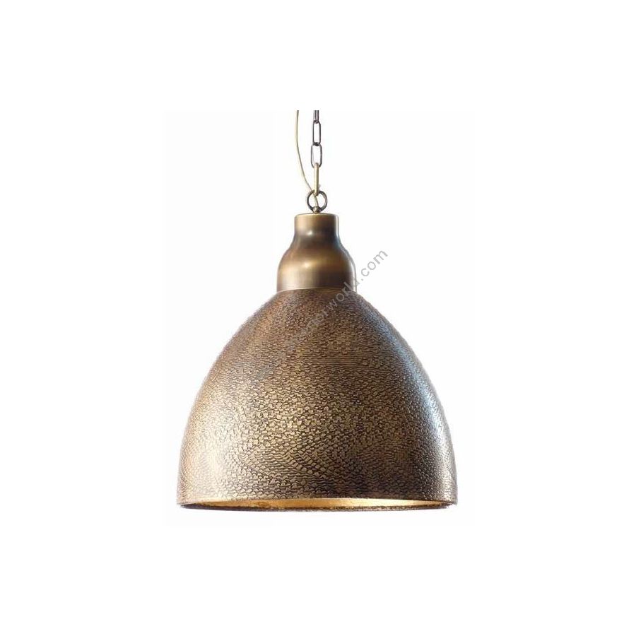 Hängeleuchte aus gehämmertem Messing. Beleuchtungselement, das das Licht mit großer Wirkung in die Umgebung streut und eine warme und einladende Atmosphäre schafft.