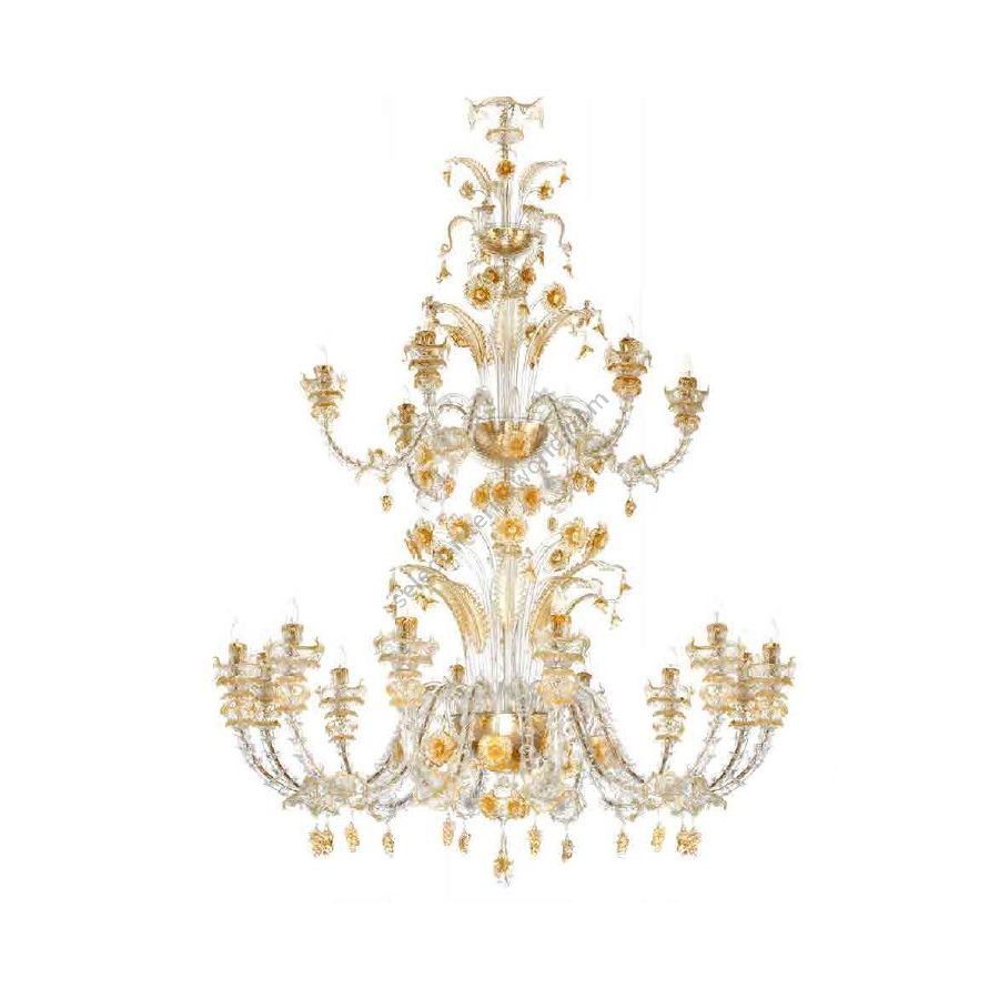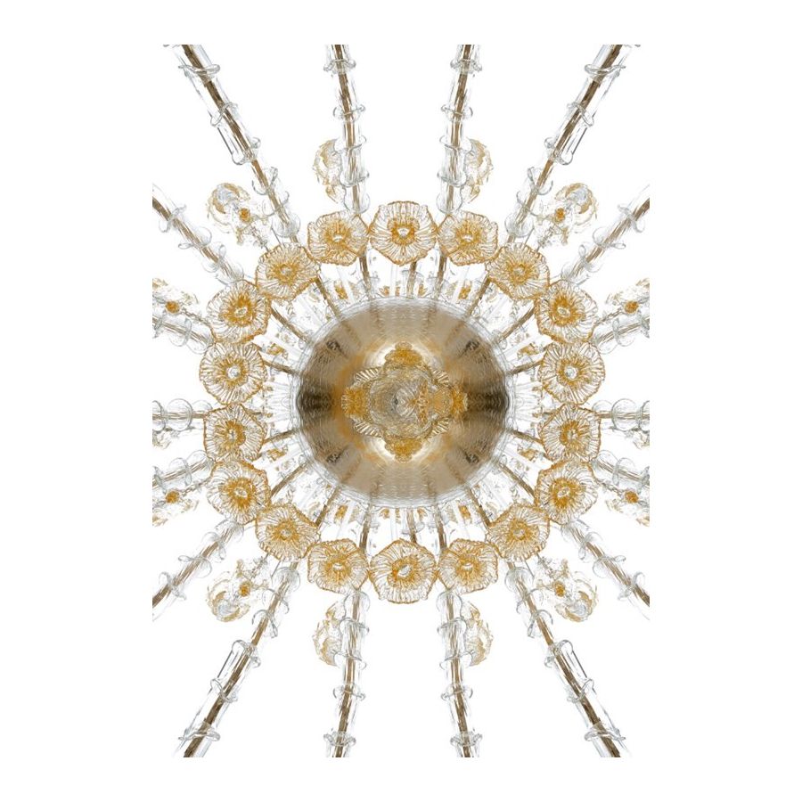 Kronleuchter aus transparentem Muranoglas mit Goldverzierung. Beleuchtungselement, das das Licht mit großer Wirkung in die Umgebung streut und eine warme und einladende Atmosphäre schafft.