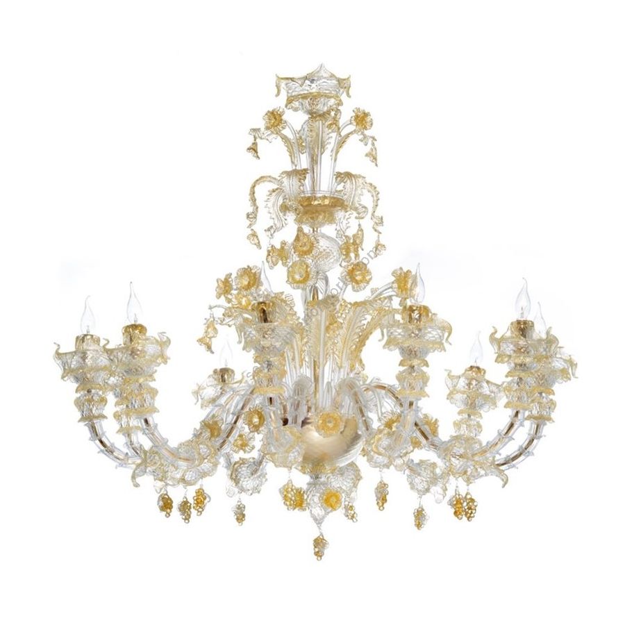 Kronleuchter aus transparentem Muranoglas mit Goldverzierung. Beleuchtungselement, das das Licht mit großer Wirkung in die Umgebung streut und eine warme und einladende Atmosphäre schafft.