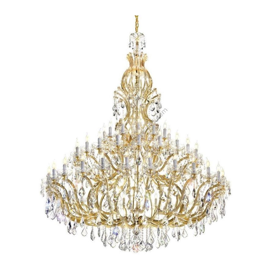 Mariateresa-Kronleuchter mit vergoldetem Metallrahmen, bedeckt von transparenten Glasarmen und transparenten Kristallanhängern. Beleuchtungselement, das das Licht mit großer Wirkung in die Umgebung streut und eine warme und einladende Atmosphäre schafft.