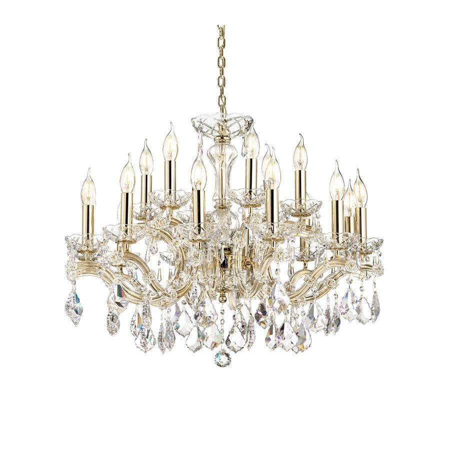 Mariateresa-Kronleuchter mit weichem, goldfarbenem Metallrahmen, der von transparenten Glasarmen und Anhängern aus transparentem Asfour®-Kristall bedeckt ist. Beleuchtungselement, das das Licht mit großer Wirkung in die Umgebung streut und eine warme und einladende Atmosphäre schafft.