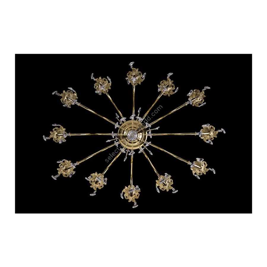 Oval Chandelier in cast brass with lampshades and crystal pendants. Lighting item that diffuses the light with great effect in the surrounding environement creating a warm an