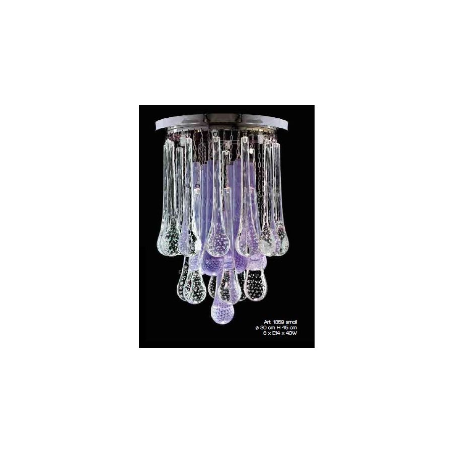 Kronleuchter mit Tropfen aus geblasenem Muranoglas in transparenter und violetter Farbe. Beleuchtungselement, das das Licht mit großer Wirkung in die Umgebung streut und eine warme und einladende Atmosphäre schafft.
