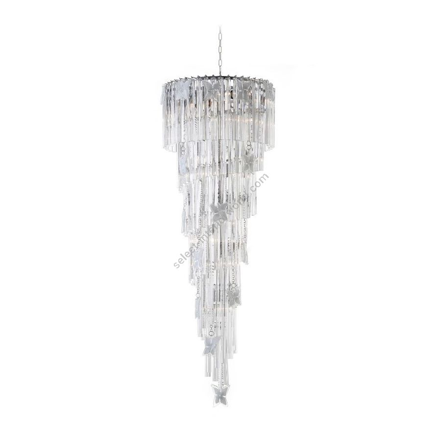 Kronleuchter mit transparentem Tridri und weißem und transparentem Schmetterling, komplett aus Muranoglas. Beleuchtungselement, das das Licht mit großer Wirkung in die Umgebung streut und eine warme und einladende Atmosphäre schafft.