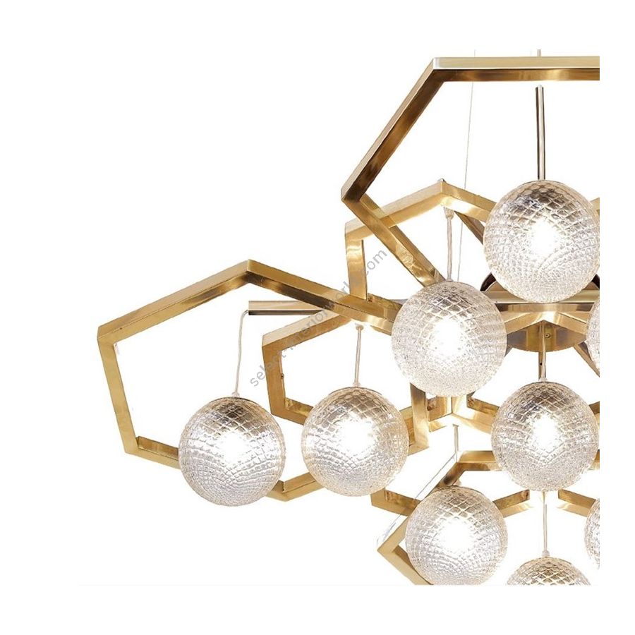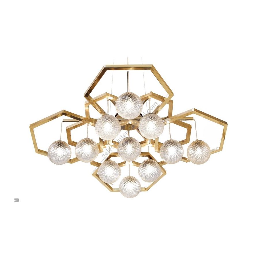 Kronleuchter aus der Hexagon-Kollektion aus poliertem Goldmessing mit Kugeln aus Muranoglas in „Ballotton“-Form. Beleuchtungselement, das das Licht mit großer Wirkung in die Umgebung streut und eine warme und einladende Atmosphäre schafft.