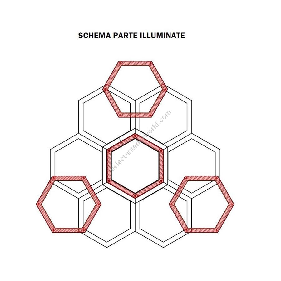 Kronleuchter aus Messing der Hexagon-Kollektion. Beleuchtungselement, das das Licht mit großer Wirkung in die Umgebung streut und so eine warme und einladende Atmosphäre schafft. Nur in den Ausführungen SGB Soft Gold gebürstet oder NB Nickel gebürstet oder lackiert erhältlich.