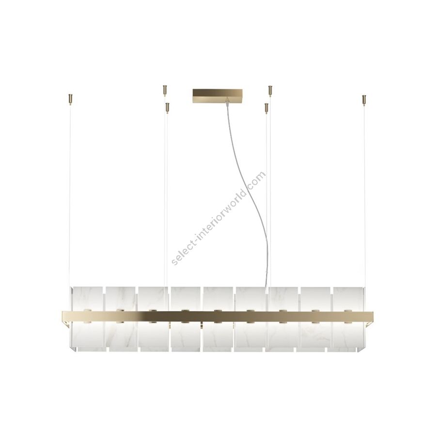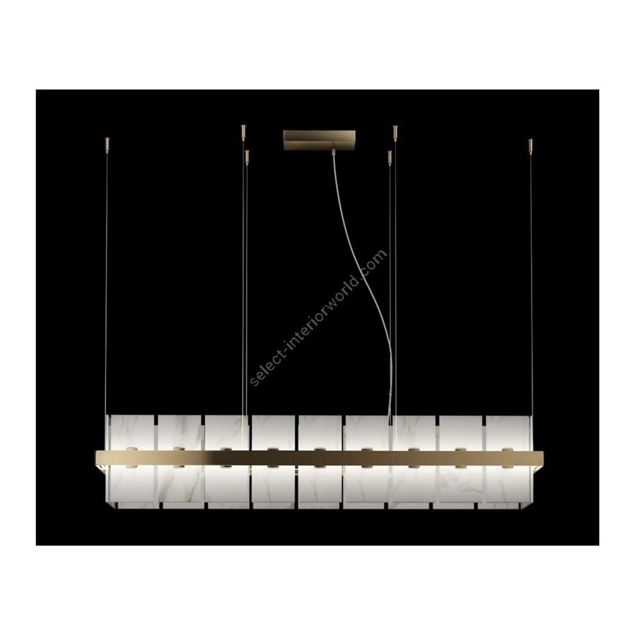 Rechteckiger Kronleuchter aus Messing mit Fliesen aus Carrara-Marmor. Beleuchtungselement, das das Licht mit großer Wirkung in die Umgebung streut und eine warme und einladende Atmosphäre schafft.