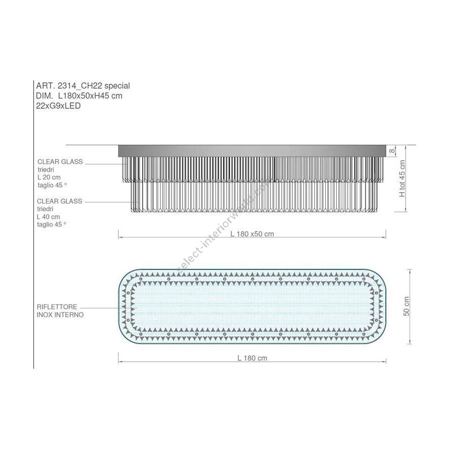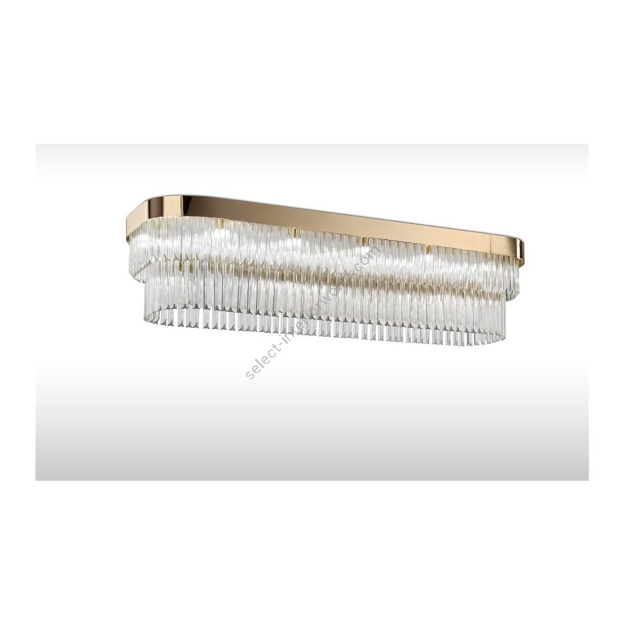 Chandelier with transparent trihedrons. Lighting fixture that diffuses the light into the surrounding environment with great effect, creating a warm and welcoming atmosphere. Shiny metallic band in SG Soft Gold. Hooking system with adjustable steel cables.
