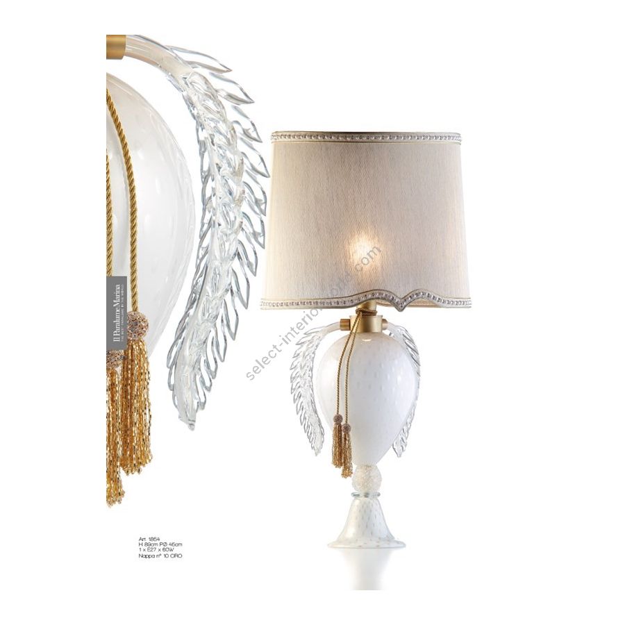 Tischlampe aus Muranoglas in Weiß und Gold. Handgefertigter Lampenschirm aus Stoff. Quaste ist nicht im Preis inbegriffen. Beleuchtungselement, das das Licht mit großer Wirkung in die Umgebung streut und eine warme und einladende Atmosphäre schafft.