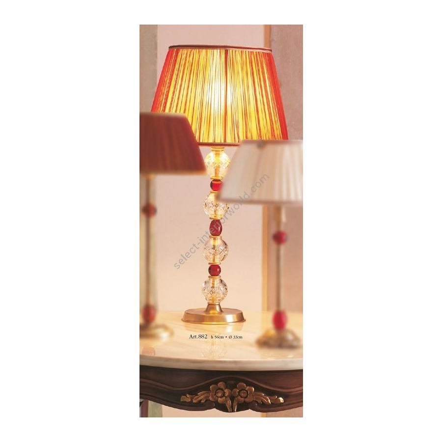 Tischlampe aus Messing mit roten und klaren Einsätzen und Lampenschirm aus Stoff. Beleuchtungselement, das das Licht mit großer Wirkung in die Umgebung streut und eine warme und einladende Atmosphäre schafft.