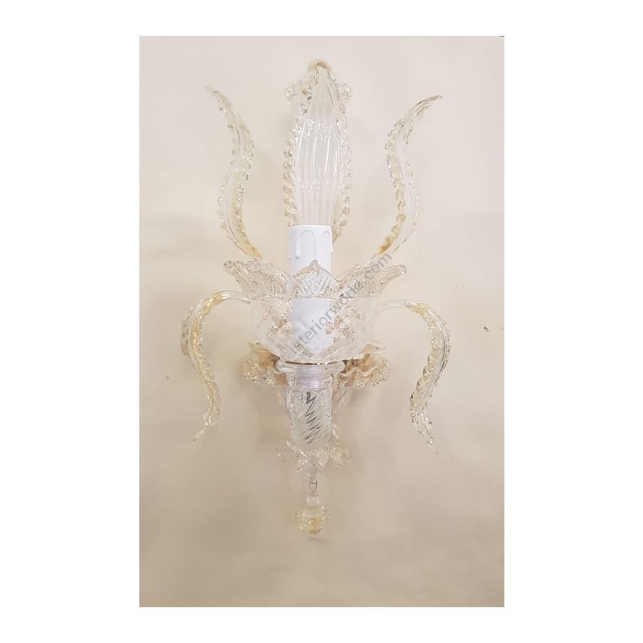 1-flammige Wandlampe aus klarem Muranoglas mit goldenen Verzierungen. Beleuchtungselement, das das Licht mit großer Wirkung in die Umgebung streut und eine warme und einladende Atmosphäre schafft.