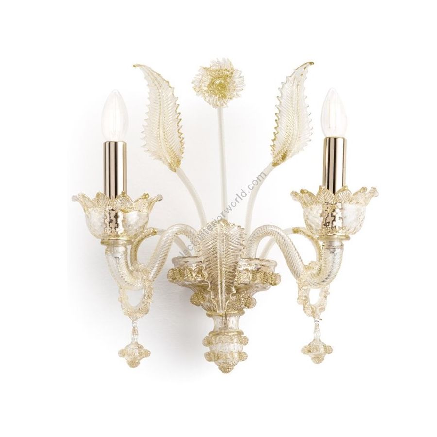 2-flammige Wandlampe aus klarem Muranoglas mit goldenen Verzierungen. Beleuchtungselement, das das Licht mit großer Wirkung in die Umgebung streut und eine warme und einladende Atmosphäre schafft.