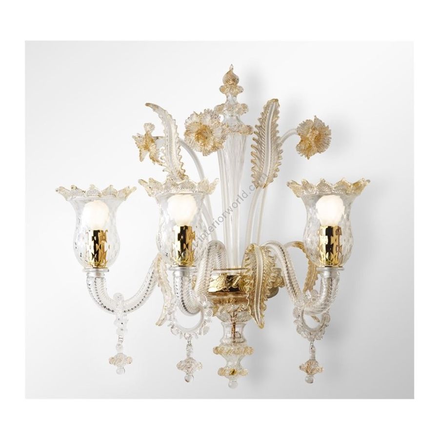 Wall lamp 3 lights Murano Glass chandelier clear with gold decorations. Lighting item that diffuses the light with great effect in the surrounding environement creating a warm and welcoming atmosphere.