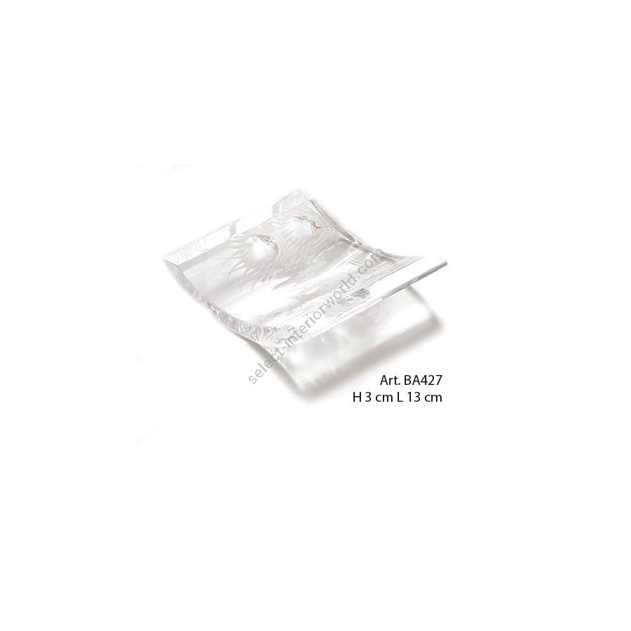 Seifenschalen aus italienischem Kristallglas mit handgravierter Pfauenfederfigur. Funktionale Elemente, die ein äußerst elegantes, einladendes und hochwertiges Badezimmer schaffen.