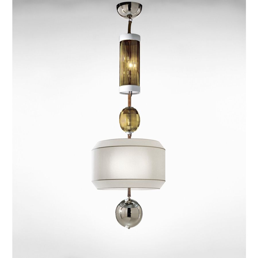 Pendelleuchte aus Glas, Metall, Kristall, Leder und Keramikelementen mit schwarzem Stoffschirm. Erhältlich in verschiedenen Farben.
