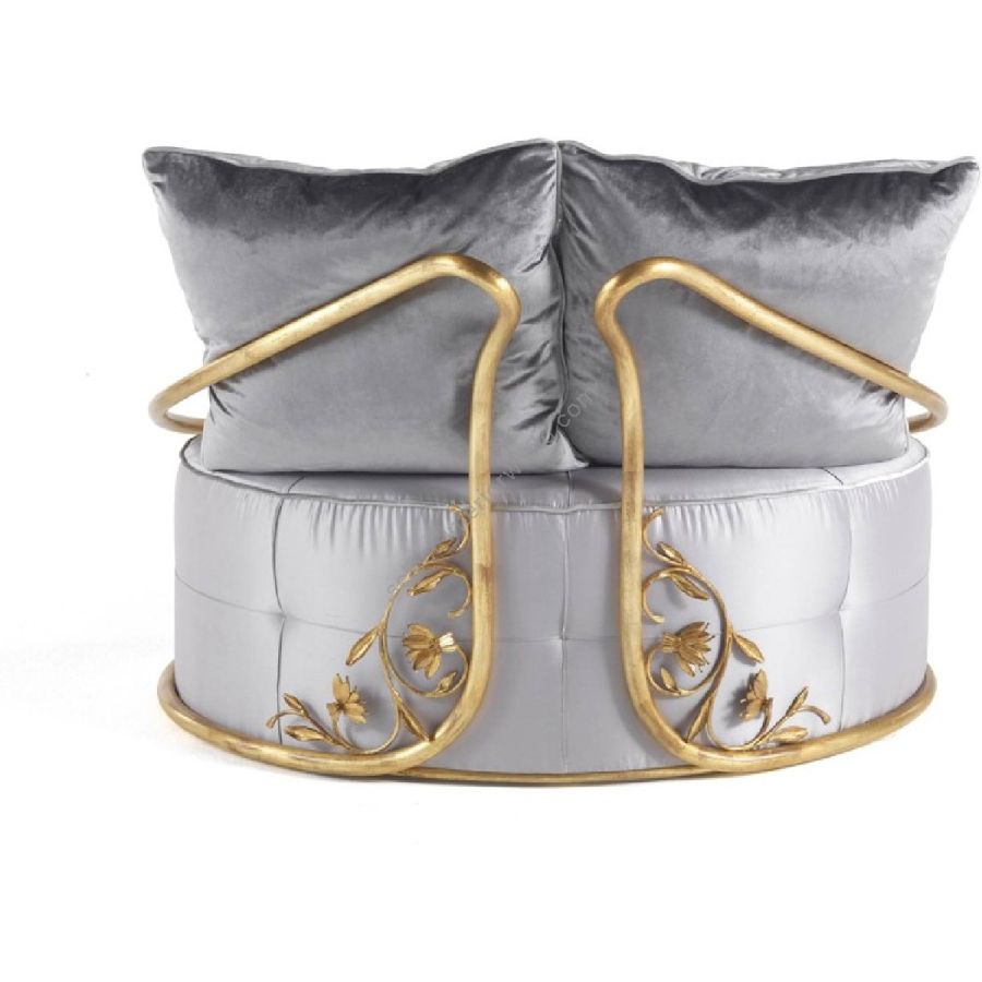 Yoshi is a pouf-shaped armchair with curved lines recalling the shape of the circle, important symbol of the Zen tradition in which two opposing but complementary forces flow eternally towards each other. The metal structure with gold leaf finish is enriched by decorative elements inspired by the natural world, such as flowers and leaves.