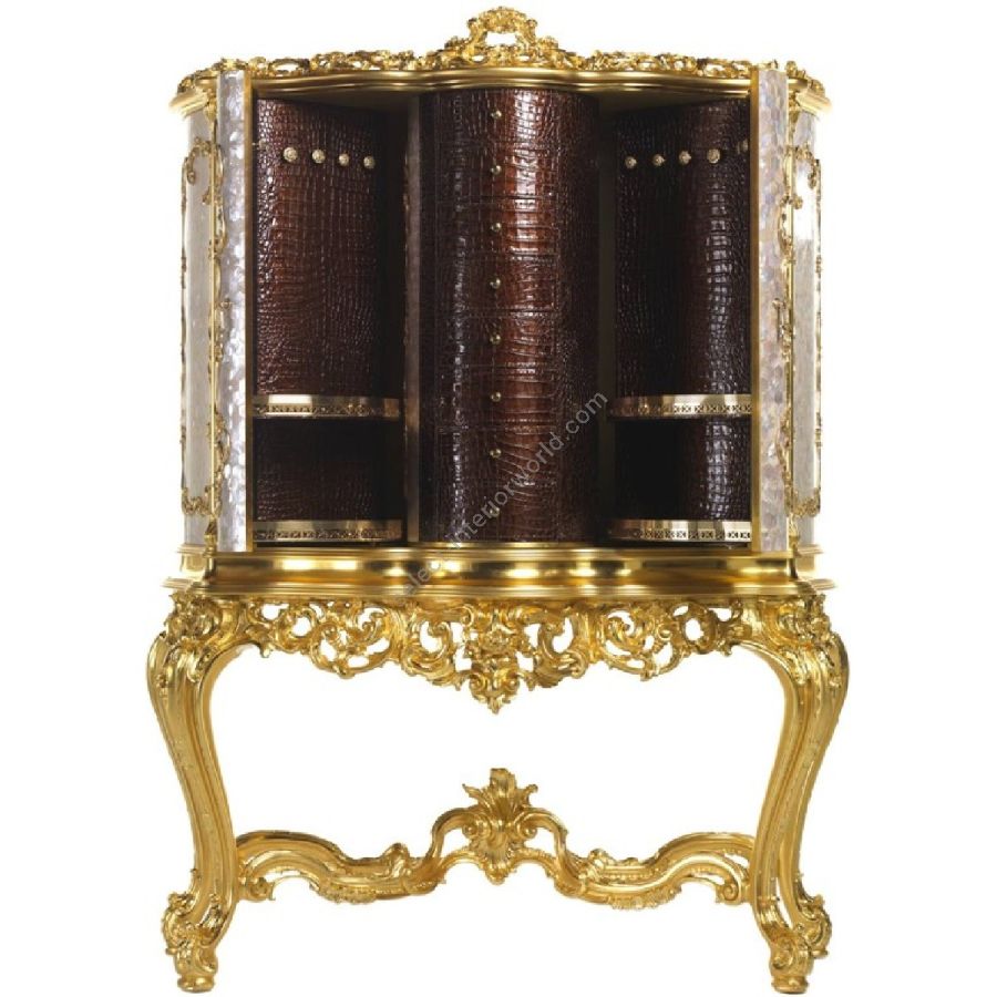 Jumbo Collection has reinterpreted this eclectic piece, the Villa Serbelloni jewel cabinet, completely realized in the furniture district of Cant by skilled craftsmen. The gold base of the original piece has been maintained, while the frame has been modified and enriched with a special mother-of-pearl pav, and adorned with decorative cast brass beveled by hand.