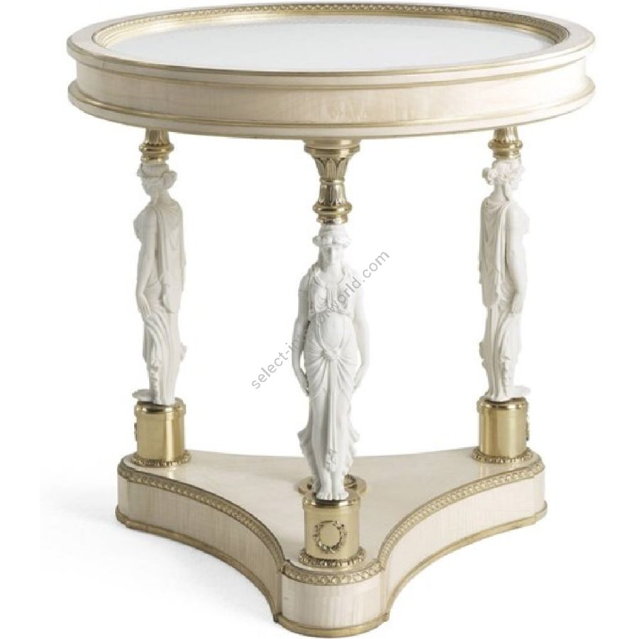 A bright and clean classic style with a western-inspired decorative spirit: the Toulouse line, composed of side table, central table, night table and chest of drawer, with gold leaf details perfectly expresses Jumbo Collections decorative spirit, through a wise combination of quality materials and high level of craftsmanship. The main feature of these elegant pieces is the presence of columns or caryatids, sculpted female figures of classic inspiration, made of porcelain with biscuit finish, lending the sculptures a matte appearance and texture to the touch.