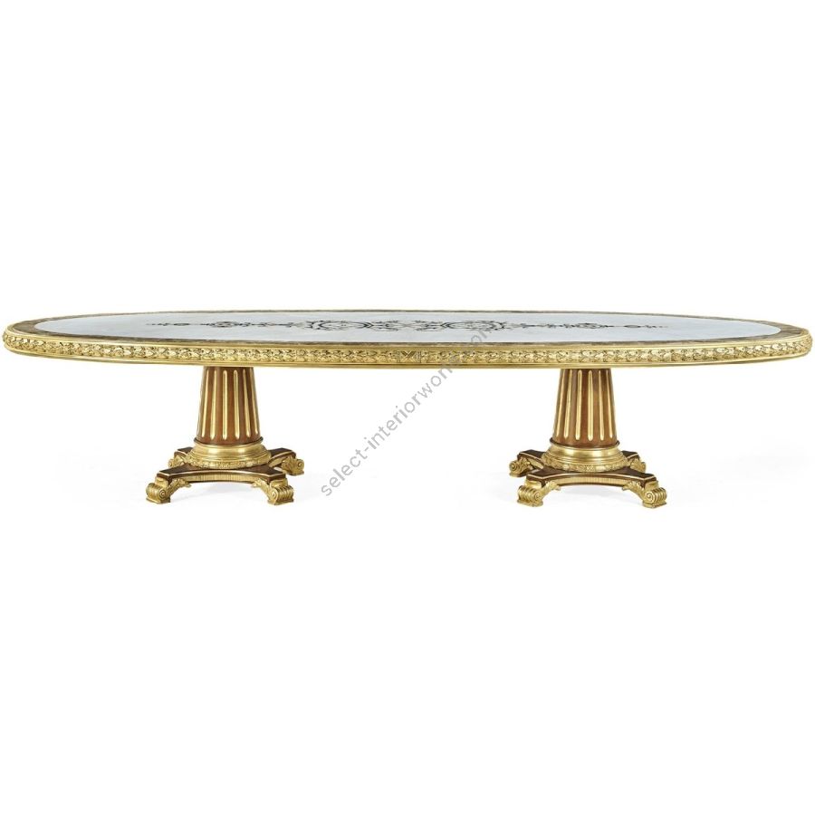 A statement piece of timeless grandeur, the Apollon dining table combines neoclassical elegance with refined craftsmanship. Its sculptural oval silhouette is crowned by a precious marble top, enhanced by inlays and wood trim that highlight its detailing. The base features majestic columns, richly carved and adorned with hand-applied gold leaf accents. The warm walnut and gold finish, along with the intricately sculpted wooden edge, add prestige to a table designed to elevate any formal dining space with distinction.