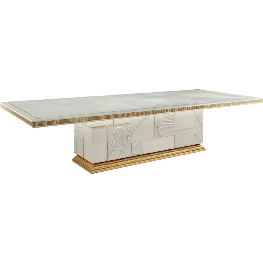 Nenuphar is a sculptural dining table, perfect protagonist of a classic and sophisticated dining room. A perfect expression of Jumbo Collection's eclectic decorative style, it stands out for the geometric shapes typical of Art Deco. Composed of a structure in white Tanganika wood and a top in the same material with patchwork inlay, the table is characterized by a base with ornamental decoration, reminiscent of water lilies evoked in its name.