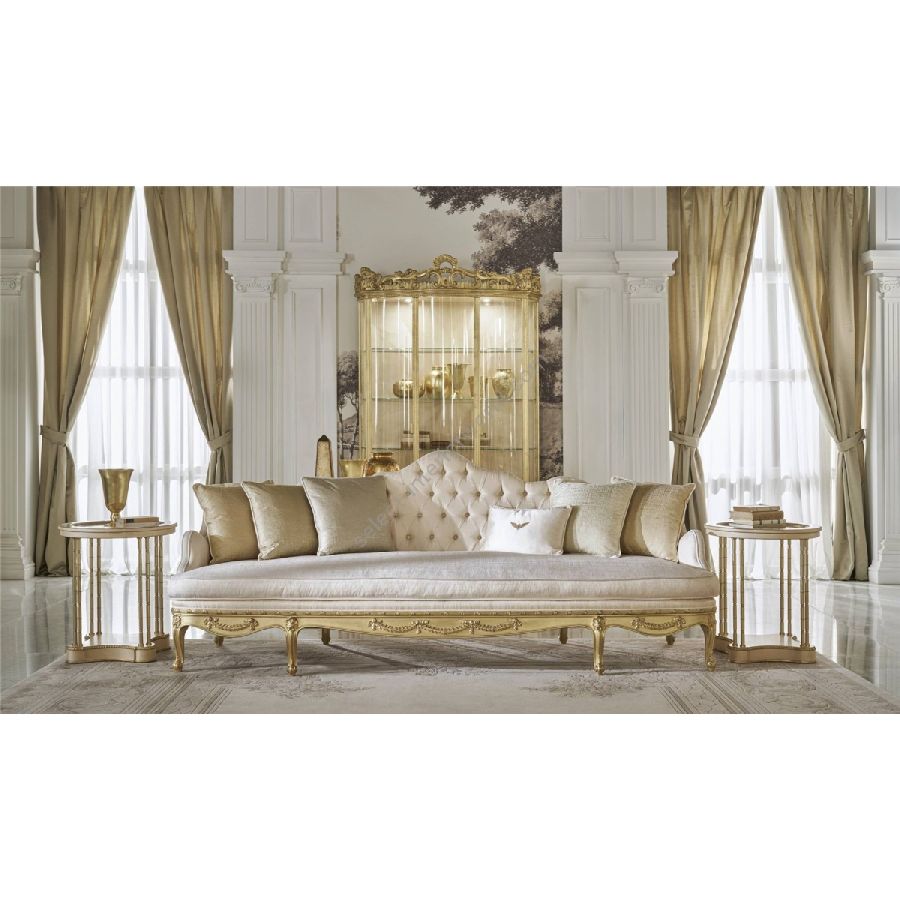 Ourlet is a line of furniture in a classic French style, expressing the refinement and elegance of the Italian artisan tradition. The piece of furniture features a structure in ray-of-sunshine maple, with brass inserts, handmade carvings and gold-leaf finish. The side doors and the central part are in glass, while the internal shelves are in crystal with spotlights. A sophisticated piece of furniture, perfect for a home with a regal and fairy-tale atmosphere.