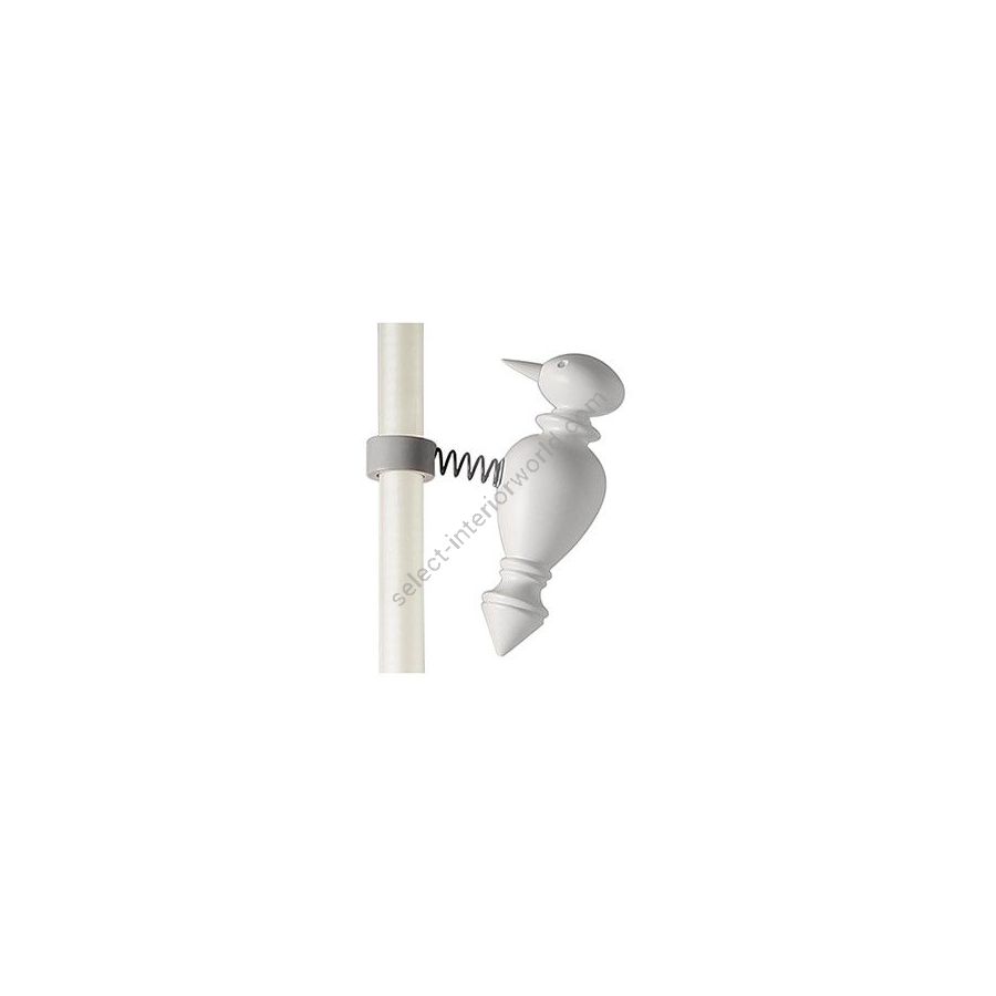 Accipicchio ist eine minimalistische Stehleuchte, die von der Welt der Fauna inspiriert ist: Die Lichtachse aus satiniertem weißem Glas kann verändert werden, indem man einen weißen Specht entlang des Diffusors schiebt oder ihn mit einem dicken schwarzen Polyethylennetz verbindet, das das Licht dämpft.