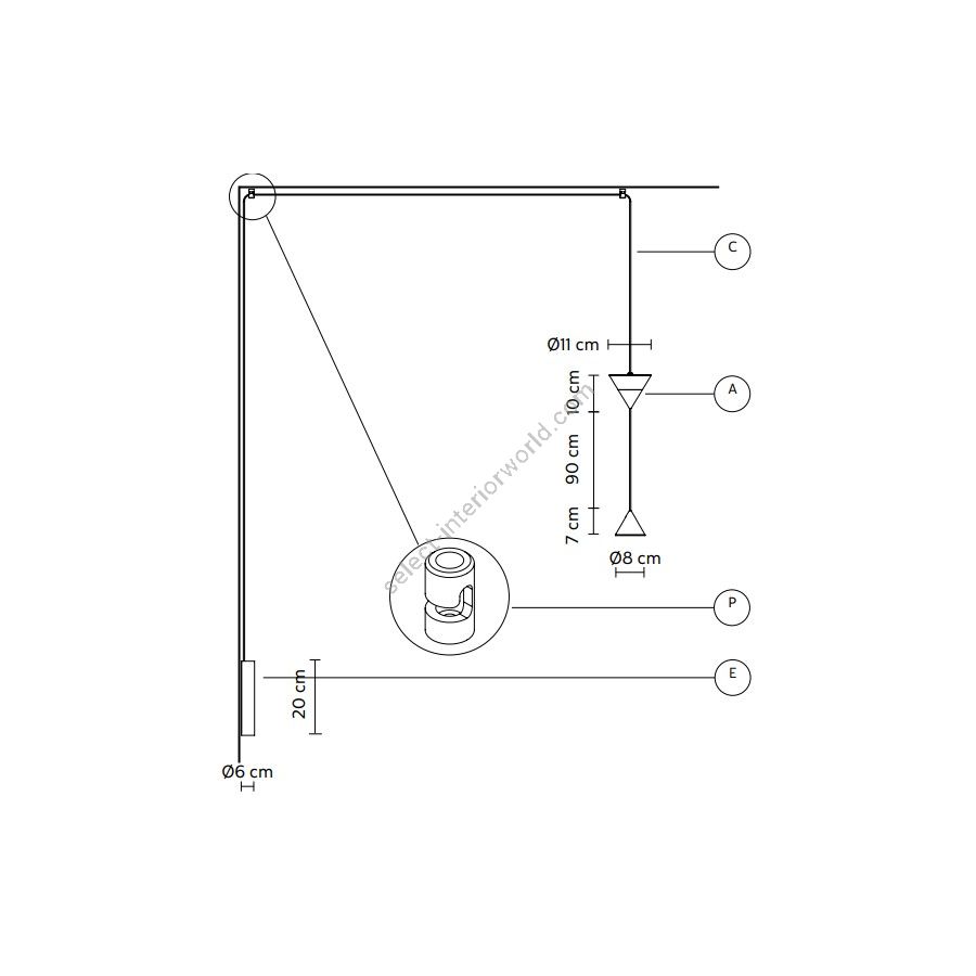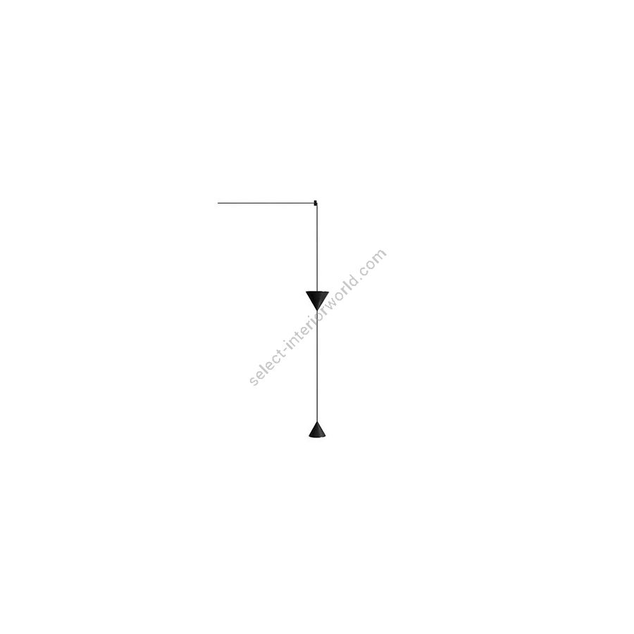 Der Kegeldiffusor dient als Ausgangspunkt für Decken- und Wandaufhängungen und kann dank langer, dünner Kabel, die raffinierte Kombinationen ermöglichen, in verschiedenen Höhen aufgehängt werden. Das Kabel kann sogar zwei Kegelkörper halten, die das Licht streuen: einen kleineren mit nach unten gerichtetem Lichtstrahl und einen größeren mit nach oben gerichtetem Lichtstrahl. Die beiden Kegelkörper können je nach Bedarf in Abstand zueinander angeordnet und mit einer speziellen schwarzen Aluminiumklemme an der Decke oder Wand befestigt werden.