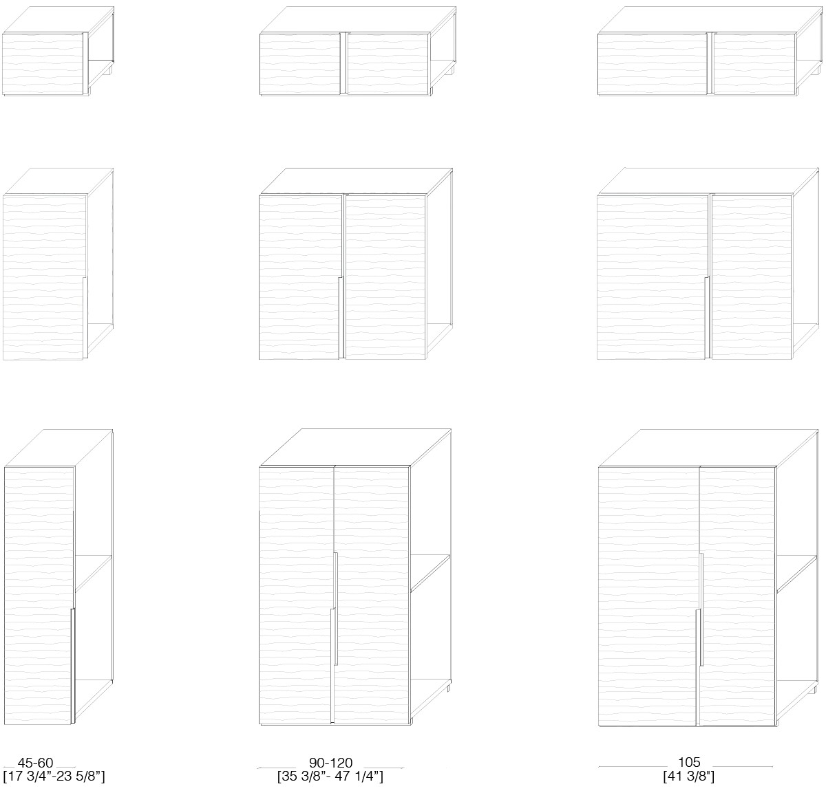 Customizable in all the essences of the collection, in lacquered and aniline-dyed wood in all RAL colours, as well as in liquid velvet, the Onda day system is available in combination with integrated wall panels and doors.