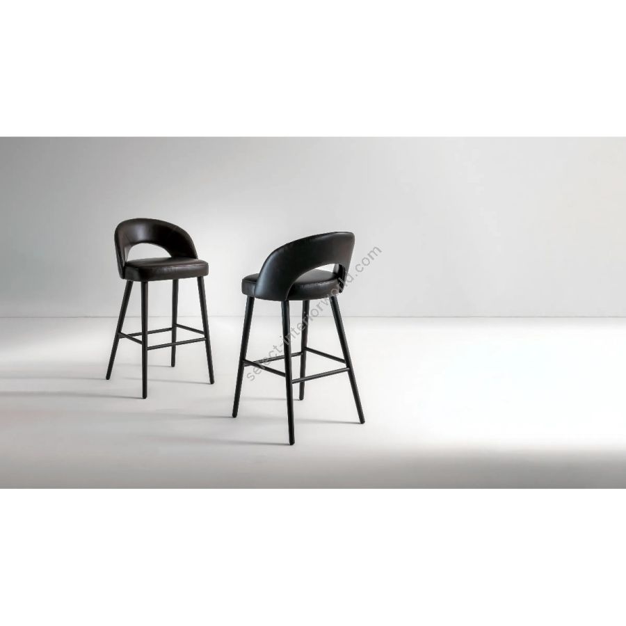 Padded high stool with legs in natural, stained or lacquered ash wood, and covered in leather, velvet or fabric.