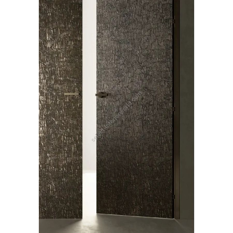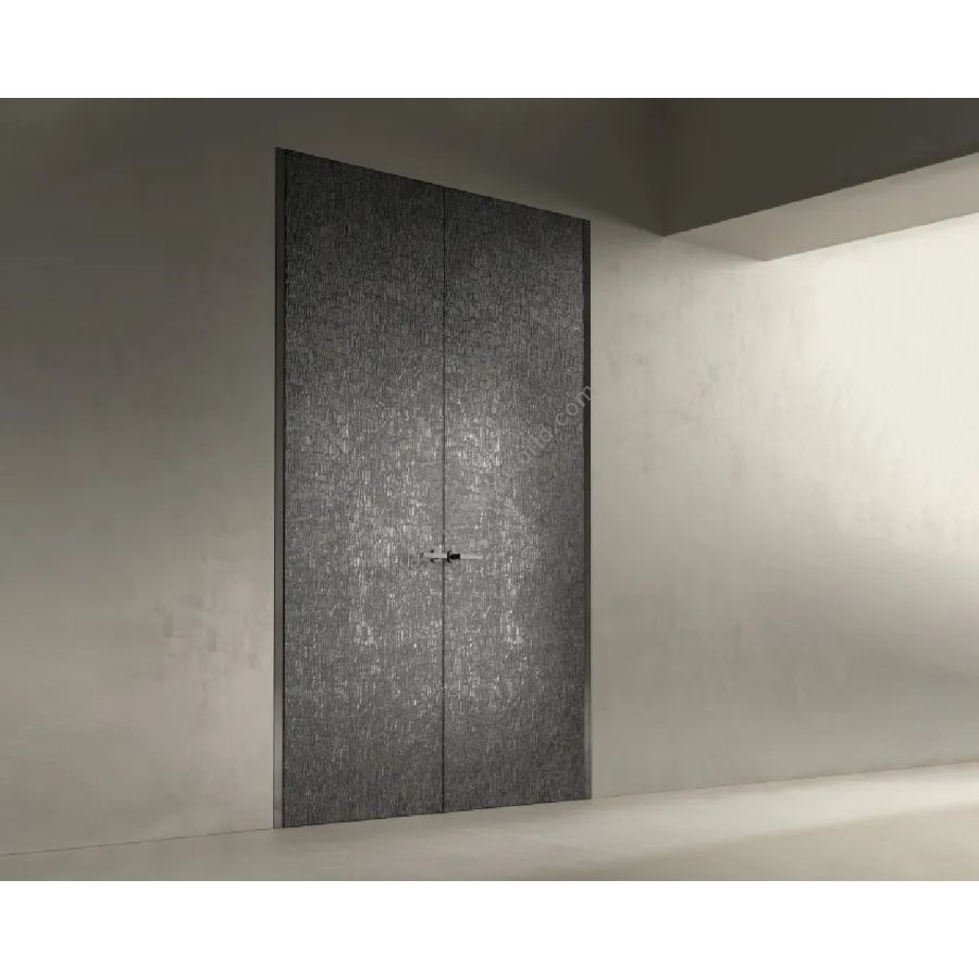 Hinged door in wood with Liquid Metal finish and Corteccia texture on the visible side.