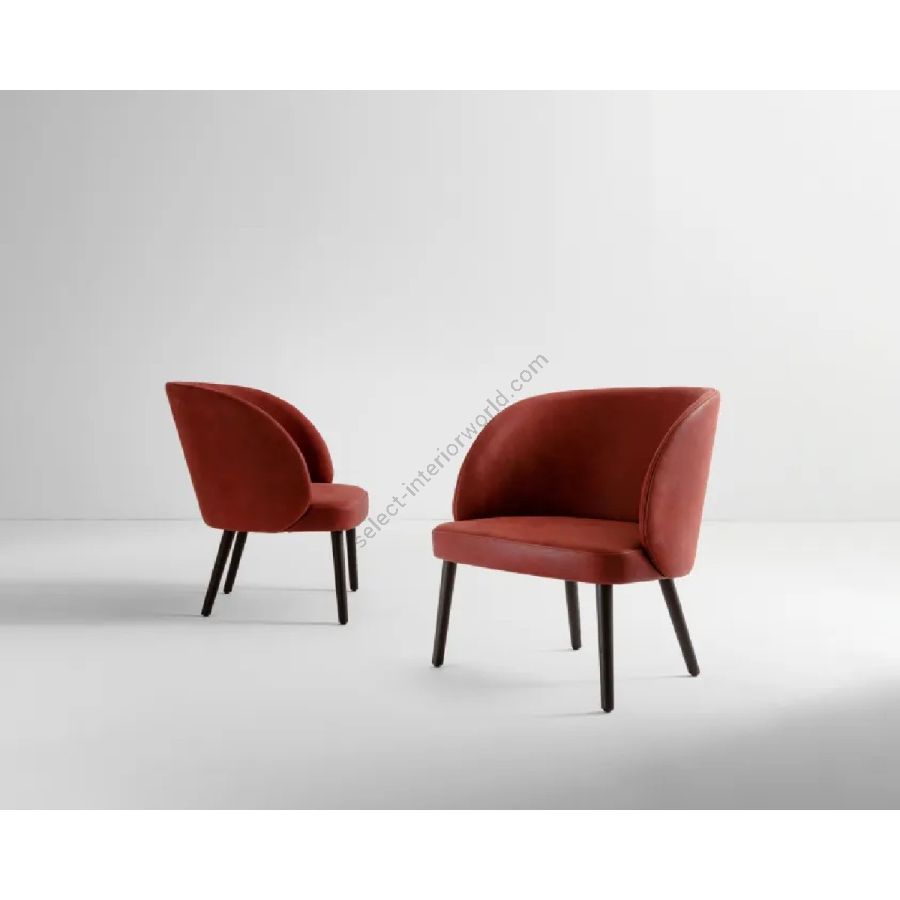 Padded small armchair with legs in natural, stained or lacquered beech or ash wood, and covered in leather, velvet or fabric.