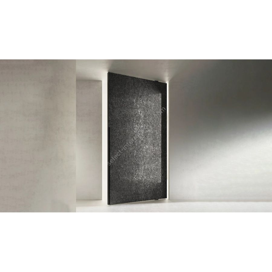 Pivot door in wood with Liquid Metal finish and Corteccia texture on the visible side. Metal handle carved into the thickness of the door.