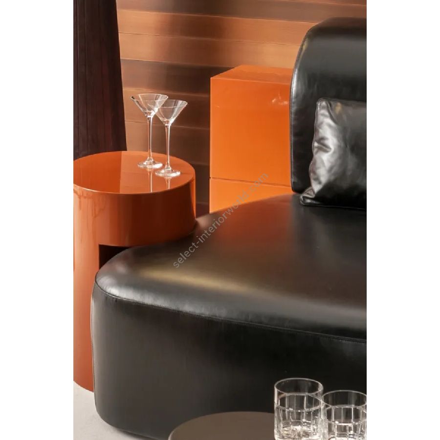 The backrest and integrated elements are available in plain, dyed, matt or glossy lacquered wood, and in various finishes from the Laurameroni collection. Decorative cushions are available.