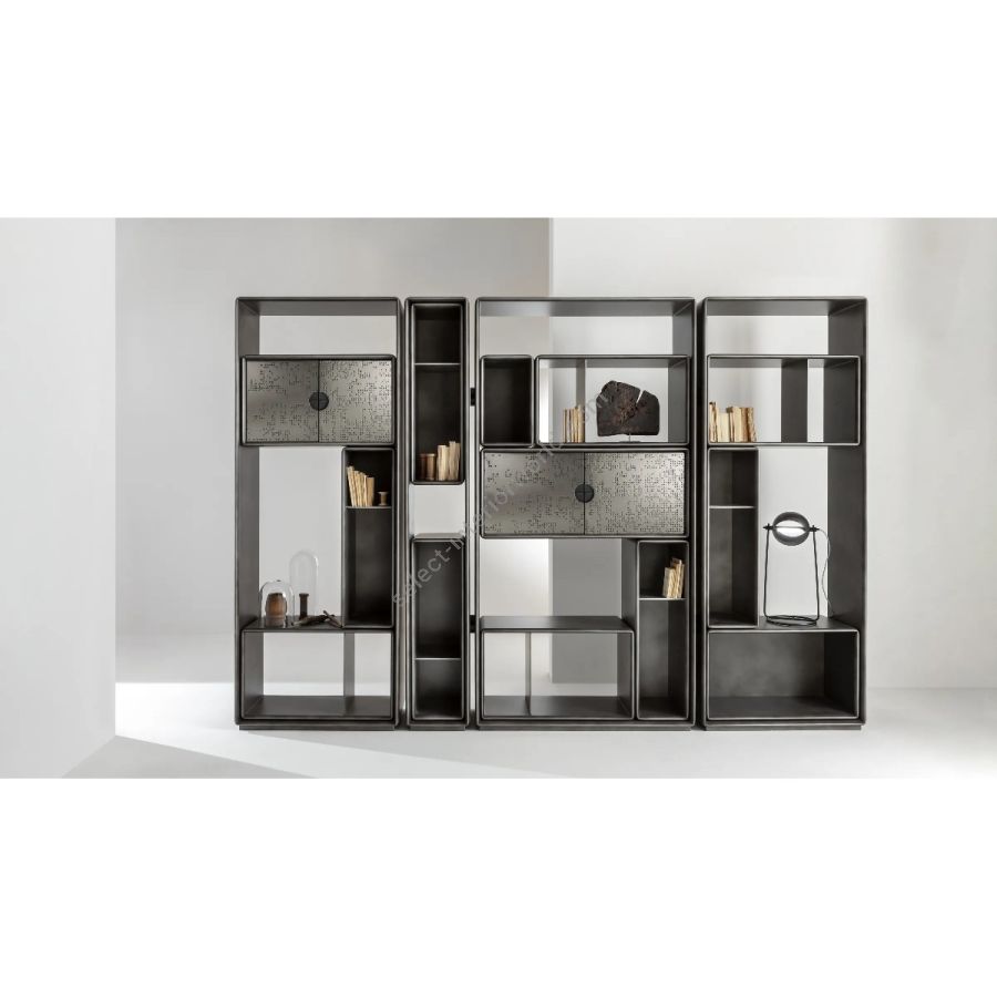 Modular bookcase with rounded wooden structure and elements, hinged doors and design handle in burnished brass.