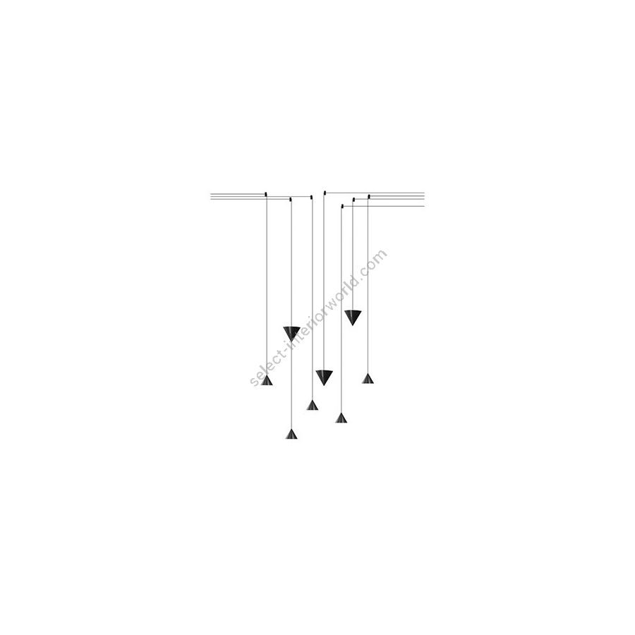 Der Kegeldiffusor dient als Ausgangspunkt für Decken- und Wandaufhängungen und kann dank langer, dünner Kabel, die raffinierte Kombinationen ermöglichen, in verschiedenen Höhen aufgehängt werden. Das Kabel kann sogar zwei Kegelkörper halten, die das Licht streuen: einen kleineren mit nach unten gerichtetem Lichtstrahl und einen größeren mit nach oben gerichtetem Lichtstrahl. Die beiden Kegelkörper können je nach Bedarf in Abstand zueinander angeordnet und mit einer speziellen schwarzen Aluminiumklemme an der Decke oder Wand befestigt werden.