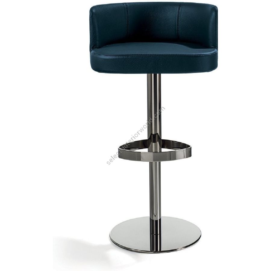 Hocker mit Sitz aus geformtem Polyurethanschaum mit hoher Dichte. Nicht abnehmbarer Stoff- oder Lederbezug. 360° höhenverstellbarer Drehfuß mit „Stabilus“-Pneumatiksäule in den Oberflächen: Hellgold glänzend, Champagnergold matt, Chrom glänzend, Schwarzchrom glänzend, Nickel matt. Rückenlehne auch mit oder ohne gesteppter vertikaler Riffelung oder „Sequence“-Dekoration erhältlich.