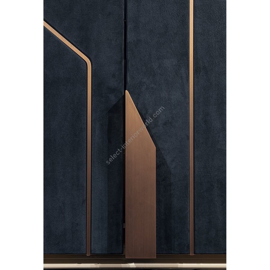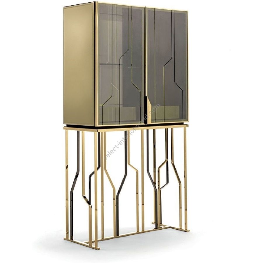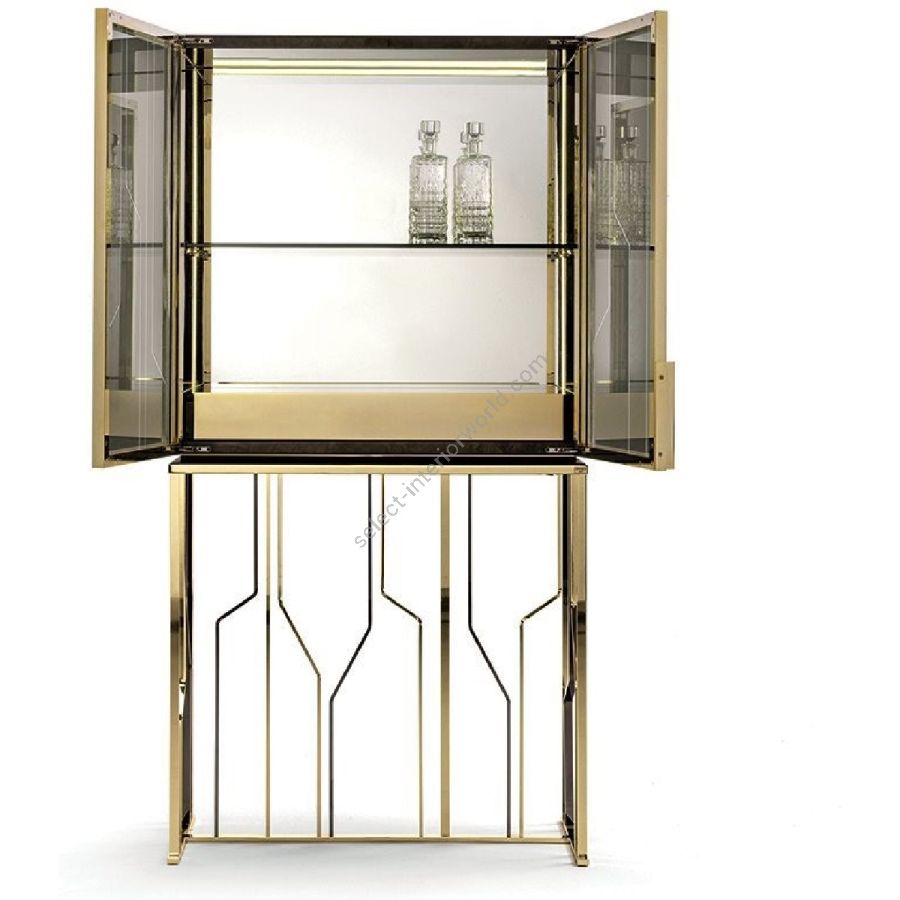 Bareinheit mit Metallbasis, erhältlich in den folgenden Ausführungen: Schwarzes Roségold, helles schattiertes Braun, helles Hellgold, mattes Champagnergold, glänzendes Chrom, glänzendes schwarzes Chrom, matte Satinbronze, helles Roségold, mattes Roségold. Zweifarbige Lackierung auf Anfrage. A - Schrankversion komplett aus Holz in glänzendem Ebenholz, glänzendem Sycamore frisè oder glänzendem Nussbaumholz mit geformten Metallprofilen in der gleichen Ausführung wie der Sockel, eingebaut in die Türen. Innen in glänzender Pulverfarbe lackiert. Der Schrank ist mit einer Schublade mit Metallfront und einem zentralen Regal aus transparentem gehärtetem Glas 8 mm ausgestattet. Rückwand im Neutralspiegel. Beleuchtung mit dimmbarem LED-Streifen. Ein Berührungsschalter schaltet das Licht ein.Griff aus abgestimmtem Metall. Top in Bronze oder Rauchspiegel. B - Schrankversion, vollständig mit Leder aus dem Sortiment bezogen, mit geformten Metallprofilen in der gleichen Ausführung wie der Sockel, eingebaut in die Türen. Innen in glänzender Pulverfarbe lackiert. Der Schrank ist mit einer Schublade mit Metallfront und einem zentralen Regal aus transparentem gehärtetem Glas 8 mm ausgestattet. Rückwand im Neutralspiegel. Beleuchtung mit dimmbarem LED-Streifen. Ein Berührungsschalter schaltet das Licht ein.Griff aus abgestimmtem Metall. Top in Bronze oder Rauchspiegel. C - Kabinettversion in bronzefarbenem oder rauchfarbenem StopSol-Glas mit geätztem Dekor auf den Türen. Seitenteile in Bronze oder rauchfarbenem, abgeschrägtem Spiegel. Türen mit Metallkante in der gleichen Ausführung wie der Sockel. Der Schrank ist mit einer Schublade mit Metallfront und einem zentralen Regal aus transparentem gehärtetem Glas 8 mm ausgestattet. Innenausstattung aus glänzendem Ebenholz, glänzendem Sycamore Frisè oder glänzendem Nussbaumwurzelholz (aus den USA) und hinten im neutralen Spiegel. Beleuchtung mit dimmbarem LED-Streifen. Ein Berührungsschalter schaltet das Licht ein.Griff aus abgestimmtem Metall. Top in Bronze oder Rauchspiegel.