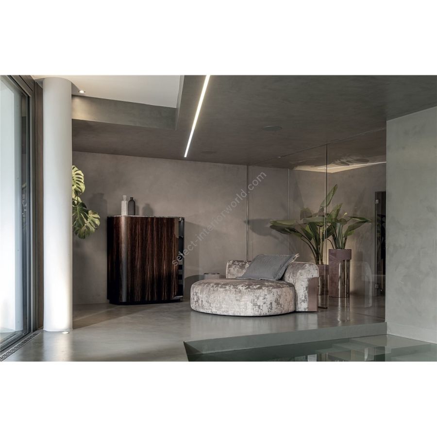 Cupboard with a trapezoidal shape, with curved corners. Wooden structure, upholstered externally in leather from the catalogue or in wood: Glossy/matt eucalyptus, Glossy/matt ebony, Glossy/matt mediumCanaletto walnut, Glossy/matt sycamore frisè, Matt liquorice stained ash wood. The inside of the structure is finished in glossy lacquer in colours from the catalogue, including the two exclusive colours “Quartz” and“Lilac grey”, or in matt bronze lacquer. The cupboard is made with two distinct parts: The right door shows a semi-open compartment with LED lighting complete with a wood shelf and a bronzed glass shelf. Inside the compartment, there are 3 bottle drawers and the base of the top is in marble, coordinated with the top.The back wall of the cupboard is covered in mirror. The left door completely hides the compartment, which as 2 lacquered drawers coordinated with the internal structure and a glass shelf. The back is lacquered and coordinated with the internal structure. The trapezoidal marble top (20 mm thick) is in: Travertino,Silver Beola, Cipollino marble, Arabescato Orobico marble, Silver Stream marble, White Carrara marble,Imperial Brown marble, Elegant Brown marble, Sahara Noir marble (polyester finish), Dover White marble,Guatemala Green marble, Red Levanto marble, Shale Rosewood marble, Emperador Dark marble, SilverWave marble, Agatha Black marble, Frappuccino marble, Calacatta marble, Patagonia marble, Juliet Quartz marble.