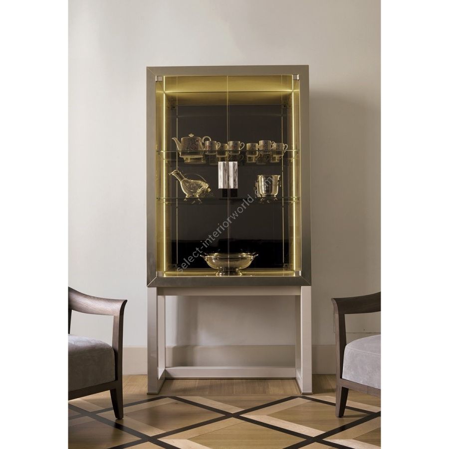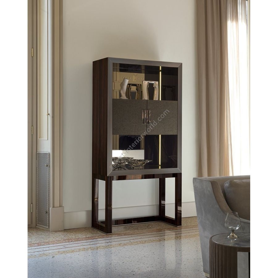 Hochschrank im Stil eines Schranks mit zwei zentralen Türen, die mit Leder oder Kaschmir von Loro Piana Interiors aus dem Sortiment bezogen sind, oder im Stil einer Vitrine mit zwei Türen in Bronze oder Rauchglas mit zwei Innenregalen aus transparentem Kristallglas. Basis und Struktur aus Holz: glänzend lackiertes Holz in verschiedenen Farben, glänzendes/mattes Ebenholz, glänzendes/mattes Nussbaum Canaletto, glänzendes/mattes Platanenfrisè. Profil von Basis und Rahmen aus geschliffenem Metall in den Ausführungen: Schwarzes Roségold, helles schattiertes Braun, helles helles Gold, mattes Champagnergold, glänzendes Chrom, glänzendes schwarzes Chrom, matte Satinbronze, helles Roségold, mattes Roségold. Griff aus Marmor nach Wahl des Kunden. Auf der Rückseite des Schranks ist ein Spiegel in Bronze- oder Rauchoptik angebracht. An den Seiten der Rückseite beleuchten zwei dimmbare LED-Lichtleisten das Innere des Schranks. Sie werden mit einem berührungsempfindlichen Schalter eingeschaltet.