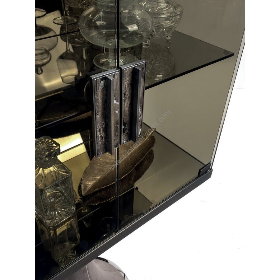 Schrankserie mit hyperboloidförmiger Basis aus Glasfaser, mit Innenstruktur aus lackiertem Metall, bezogen mit verschiedenen Ledern. A/B - Schrank in Holz oder Leder: Holzschrank: Ebenholz glänzend/matt, Nussbaum Canaletto glänzend/matt, Sycamore Frisè glänzend/matt, Wurzelholz Nussbaum glänzend. Türen im gleichen Holz wie die Schrankstruktur oder mit Leder aus dem Sortiment bezogen. Innen mit Kat. P.3 Wildleder, der Schrank ist mit einer Schublade mit Metallfront und einem zentralen Regal aus transparentem gehärtetem Glas 8 mm ausgestattet. Hinten im neutralen Spiegel. Beleuchtung mit dimmbarem LED-Streifen. Ein Berührungsschalter schaltet das Licht ein.Griffe aus Metall mit Einsatz aus Marmor aus dem Sortiment. Kanten und Bodenplatte aus Metall in den Ausführungen: Black Rose Gold, Bright Shaded Brown, Bright Light Gold, Matt Champagne Gold, Bright Chrome, Bright Black Chrome, Matt Satin Bronze, Bright Pink Gold, Matt Pink Gold. 4 mm bronzefarbene oder rauchige Spiegelplatte mit Fase. C - Vitrine: Vitrine mit Seiten und Tür aus gehärtetem Bronzeglas (Rückwand aus lackiertem Holz). Der Schrank ist mit einem zentralen Regal aus transparentem gehärtetem Glas 8 mm ausgestattet. Hinten im neutralen Spiegel. Beleuchtung mit dimmbarem LED-Streifen. Ein Berührungsschalter schaltet das Licht ein. Griffe aus Metall mit Einsatz aus Marmor aus dem Sortiment. Kanten und Bodenplatte aus Metall in den Ausführungen: Black Rose Gold, Bright Shaded Brown, Bright Light Gold, Matt Champagne Gold, Bright Chrome, Bright Black Chrome, Matt Satin Bronze, Bright Pink Gold, Matt Pink Gold. 4 mm bronzefarbene oder rauchige Spiegelplatte mit Fase. D/E - Gehäuse aus Holz oder Leder: Holzgehäuse: Ebenholz glänzend/matt, Nussbaum Canaletto glänzend/matt, Ahorn Frisè glänzend/matt, Wurzelholz Nussbaum glänzend. Türen und Schubladenfronten im gleichen Holz wie die Schrankstruktur oder mit Leder aus dem Programm bezogen. Innen matt bronze lackiert. Oberflächenausführungen: 4 mm Bronze oder rauchiger Spiegel mit Facette, Sahara Noir-Marmor (Polyester-Finish), Dover White-Marmor, Panda White-Marmor, Guatemala Green-Marmor, Corteccia-Marmor, Port Saint Laurent-Marmor, Red Levanto-Marmor, Bardiglio Nuvolato-Marmor, Elegant Brown Marmor, Shale Rosewood-Marmor, Emperador Dark-Marmor, Silver Wave-Marmor, Agatha Black-Marmor, Frappuccino-Marmor, Calacatta-Marmor, Fusion Light-Marmor, Patagonia-Marmor, Explosion Blu-Marmor, Fusion Multicolor-Marmor, Juliet-Quarzmarmor. Griffe aus Metall mit Einsatz aus Marmor aus dem Sortiment (abgestimmt auf die Platte). Kanten und Bodenplatte aus Metall in den Ausführungen: Black Rose Gold, Bright Shaded Brown, Bright Light Gold, Matt Champagne Gold, Bright Chrome, Bright Black Chrome, Matt Satin Bronze, Bright Pink Gold, Matt Pink Gold. F - Sideboard: Schrank mit Seiten und Tür aus gehärtetem Bronzeglas (Rückwand aus lackiertem Holz). Zentrale Klapptür in verschiedenen Ledern bezogen. Innenseite der Klapptür mit P.3 Veloursleder bezogen. Interieur in neutralem Spiegel, zentrales Regal aus transparentem gehärtetem Bronzeglas 8 mm. Beleuchtung mit dimmbarem LED-Streifen. Ein Berührungsschalter schaltet das Licht ein. Obere Ausführungen: 4 mm Bronze oder rauchiger Spiegel mit Fase. Griffe aus Metall mit Einsatz aus Marmor aus dem Sortiment. Kanten und Bodenplatte aus Metall in den Ausführungen: Black Rose Gold, Bright Shaded Brown, Bright Light Gold, Matt Champagne Gold, Bright Chrome, Bright Black Chrome, Matt Satin Bronze, Bright Pink Gold, Matt Pink Gold.