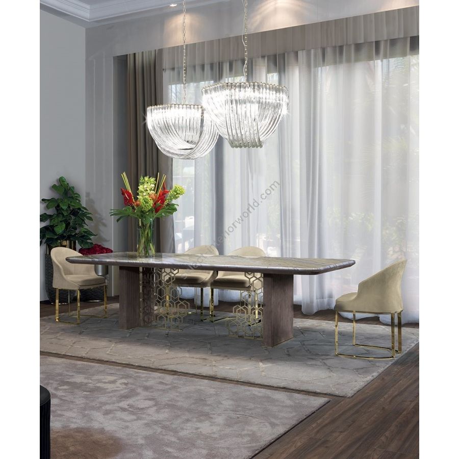 Tisch mit Basis aus einer Außenseite aus gepolstertem und gestepptem Holz mit vertikaler Riffelung oder mit 3D-Dekoration „Sequence“ aus P3-Wildleder und mit einem aus gemahlenem Metall bearbeiteten Innenteil und mit Lasercut-Dekoration „Sequence“ in den Ausführungen: Schwarz Roségold, hell schattiertes Braun, helles Hellgold, mattes Champagnergold, glänzendes Chrom, glänzendes schwarzes Chrom, matt satinierte Bronze, helles Roségold, mattes Roségold. Unterplatte bezogen mit Leder aus dem Sortiment, abgestimmt auf das Untergestell. Oberfläche der Oberfläche: 20 mm Marmor mit 20 mm Fase: Sahara Noir Marmor (Polyester-Finish), Dover White Marmor, Panda White Marmor, Guatemala Green Marmor, Corteccia Marmor, Port Saint Laurent Marmor, Red Levanto Marmor, Bardiglio Nuvolato Marmor, Elegant Brown Marmor, Shale Palisander-Marmor, Emperador Dark-Marmor, Silver Wave-Marmor, Agatha Black-Marmor, Frappuccino-Marmor, Calacatta-Marmor, Fusion Light-Marmor, Patagonia-Marmor, Explosion Blu-Marmor, Fusion Multicolor-Marmor, Julia-Quarzmarmor.