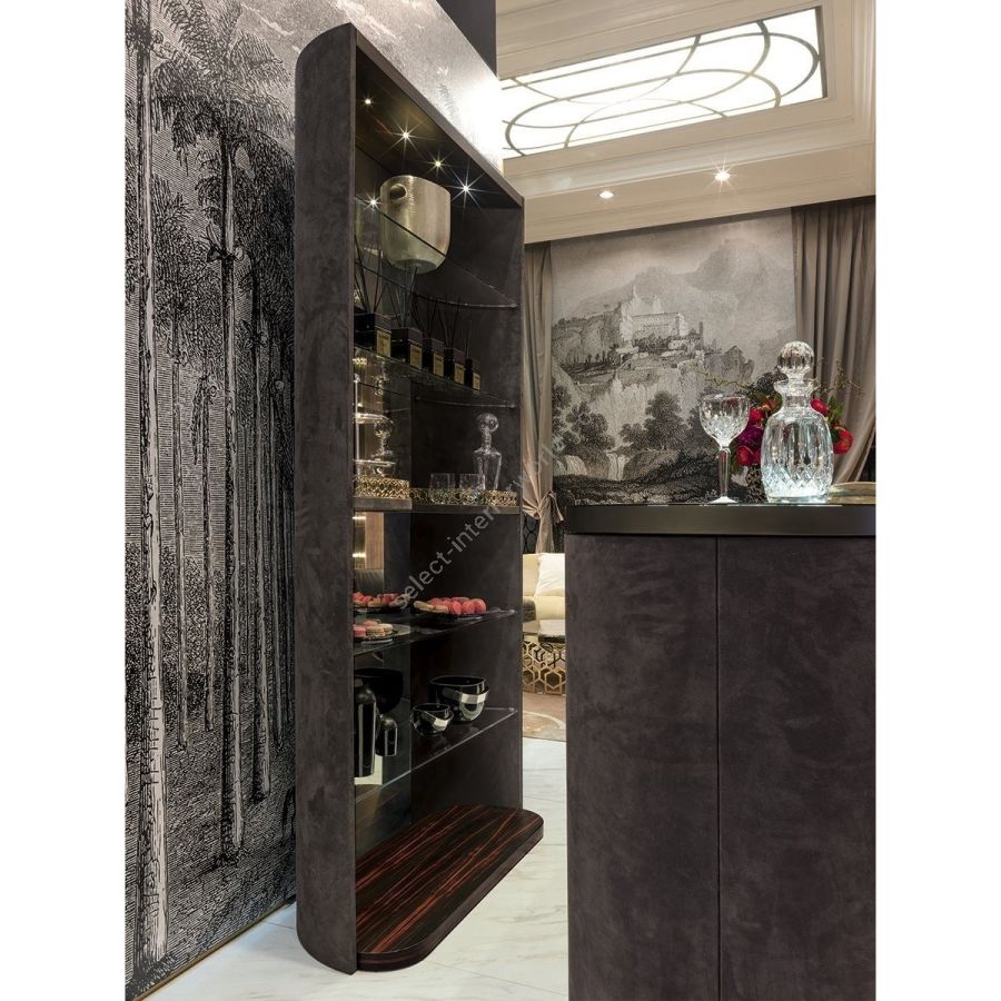Offene Vitrine und Glasvitrine mit Türen in Bronze oder Rauchkristall. Geschwungene Holzseiten mit Lederbezug aus dem Katalog. Mittelteil in Bronze oder Rauchspiegel. Geformte Regale in transparentem Kristallglas 8 mm. Mit Leder überzogene Tabletts mit Metallrändern, die mit dem „Sequence“-Muster laserverziert sind, sind in den folgenden Ausführungen erhältlich: Schwarzes Roségold, helles schattiertes Braun, helles helles Gold, mattes Champagnergold, glänzendes Chrom, glänzendes schwarzes Chrom, matt satinierte Bronze, helles Rosa Gold, mattes Roségold. Sockel und Platte aus mattem Ebenholz, oben mit drei LED-Strahlern beleuchtet.