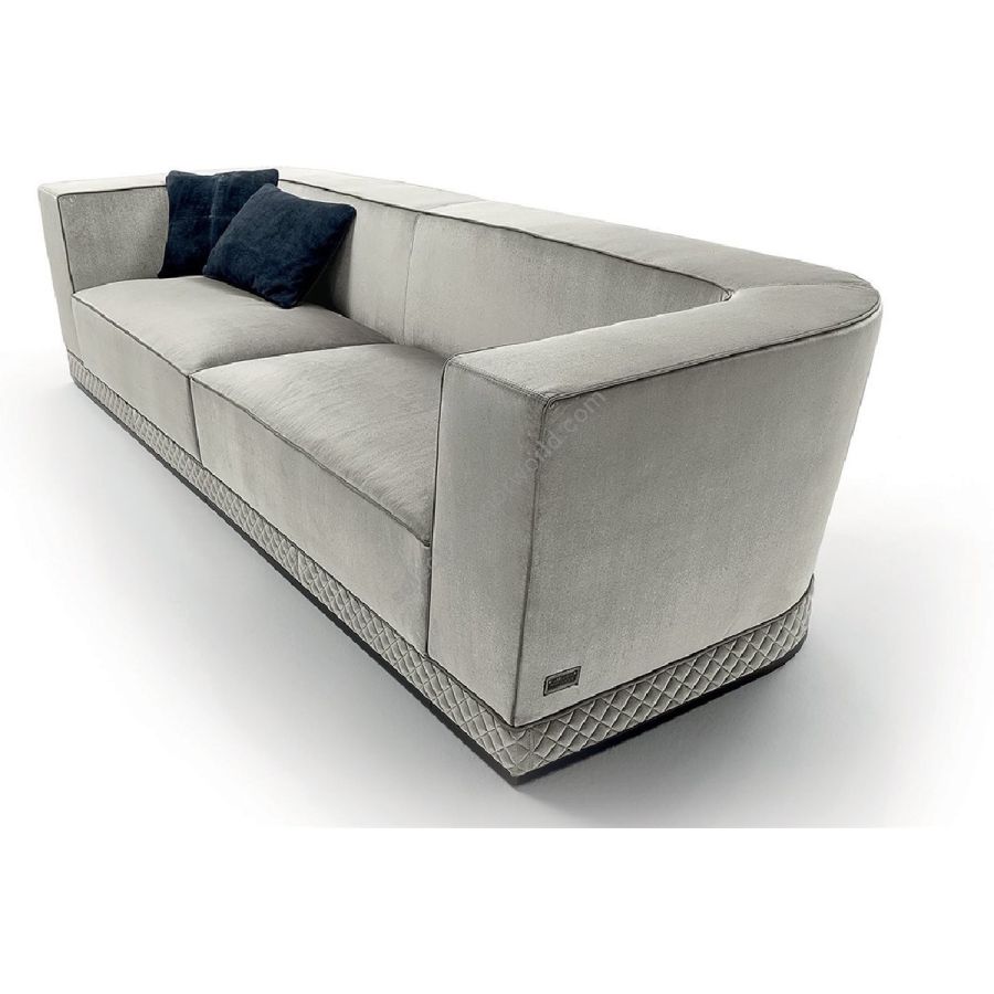 Zwei Versionen dieses Sofas: mit Standardtiefe von 100 cm und in der größeren doppelten Tiefe von 100120 cm. Verschiedene Elemente können zu Eckkompositionen kombiniert werden. Holzstruktur mit Polyurethanschaum in verschiedenen Stärken überzogen. Die Sitze haben la Buchenholzstrukturen mit elastischen Bändern, die mit dreifach dickem Polyurethanschaum bedeckt sind, der mit sterilisierten Gänsedaunen bedeckt ist, unterstützt durch eine Memory Foam-Polsterung, die es ihm ermöglicht, seine Form zu behalten. Die Strukturbasis ist aus Holz und kann mit einer glatten oder rautenförmigen gesteppten Abdeckung bedeckt werden, die mit einem verchromten Metallring in den Ausführungen veredelt ist: Satin-Nickel, helles schattiertes Braun, helles helles Gold, mattes Champagnergold, glänzendes Chrom, helles Schwarz Chrom, Bronze matt satiniert, Roségold glänzend, Roségold matt, Roségold schwarz.Rückenlehnenkissen aus sterilisierter Gänsedaune, nur in der Version mit doppelter Tiefe erhältlich. Aufgrund des speziellen Herstellungsverfahrens ist die Polsterung dieses Modells nicht abnehmbar.