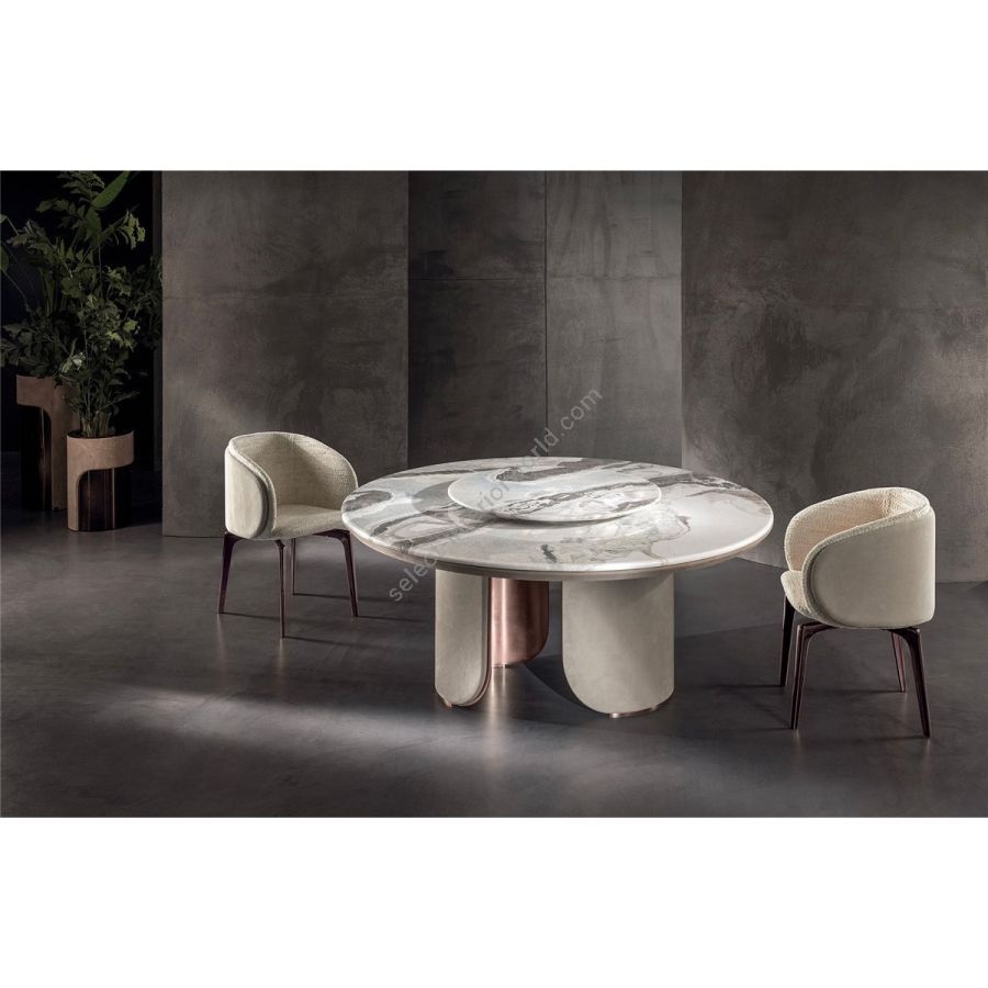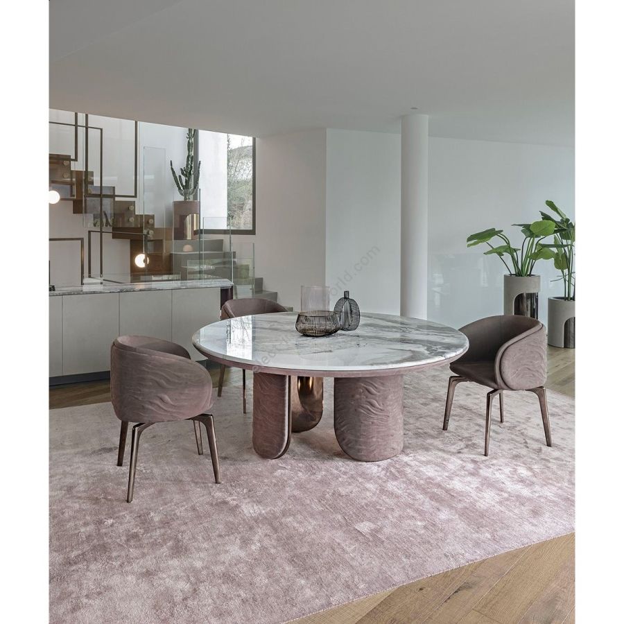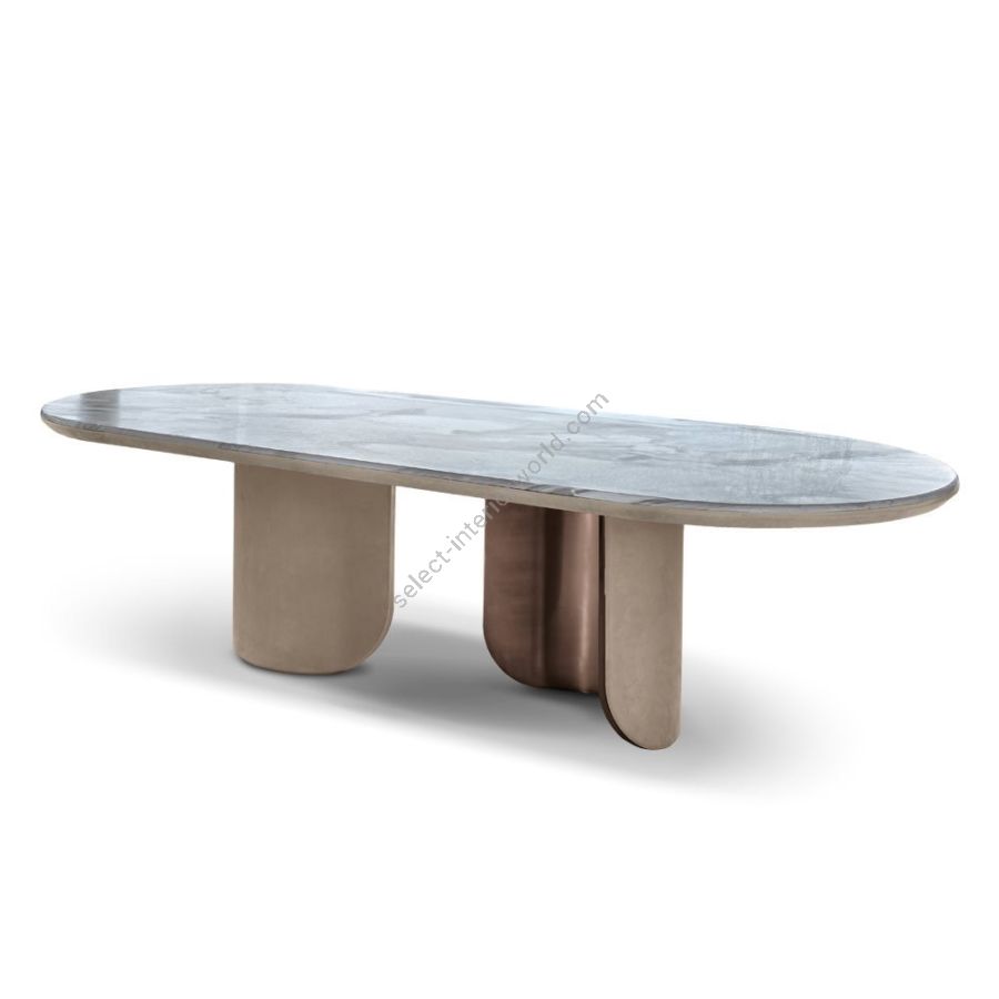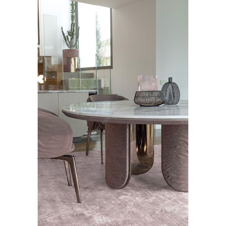Oval or round table with two semi-circular load-bearing legs. The leg interiors are in metal: satinedChampagne, Bright/satined Burnished, Shaded copper, Bright/satined brown, Bright/satined Black rose,Bright/satined light gold, Bright/satined chrome, Bright/satined black chrome, Matt satined bronze.The leg exterior is covered in smooth or quilted leather, the “Groove” decoration, in the colours from the catalogue, or glossy lacquer from the catalogue, including the two exclusive colours “Quartz” and “Lilacgrey”. The under top is coordinated with the external finish of the leg. The top is in marble, 20 mm thick: Travertino, Silver Beola, Cipollino marble, Arabescato Orobico marble, Silver Stream marble, White Carrara marble, Imperial Brown marble, Elegant Brown marble, Sahara Noir marble (polyester finish), Dover White marble, Guatemala Green marble, Red Levanto marble, Shale Rosewood marble, Emperador Dark marble,Silver Wave marble, Agatha Black marble, Frappuccino marble, Calacatta marble, Patagonia marble, JulietQuartz marble.