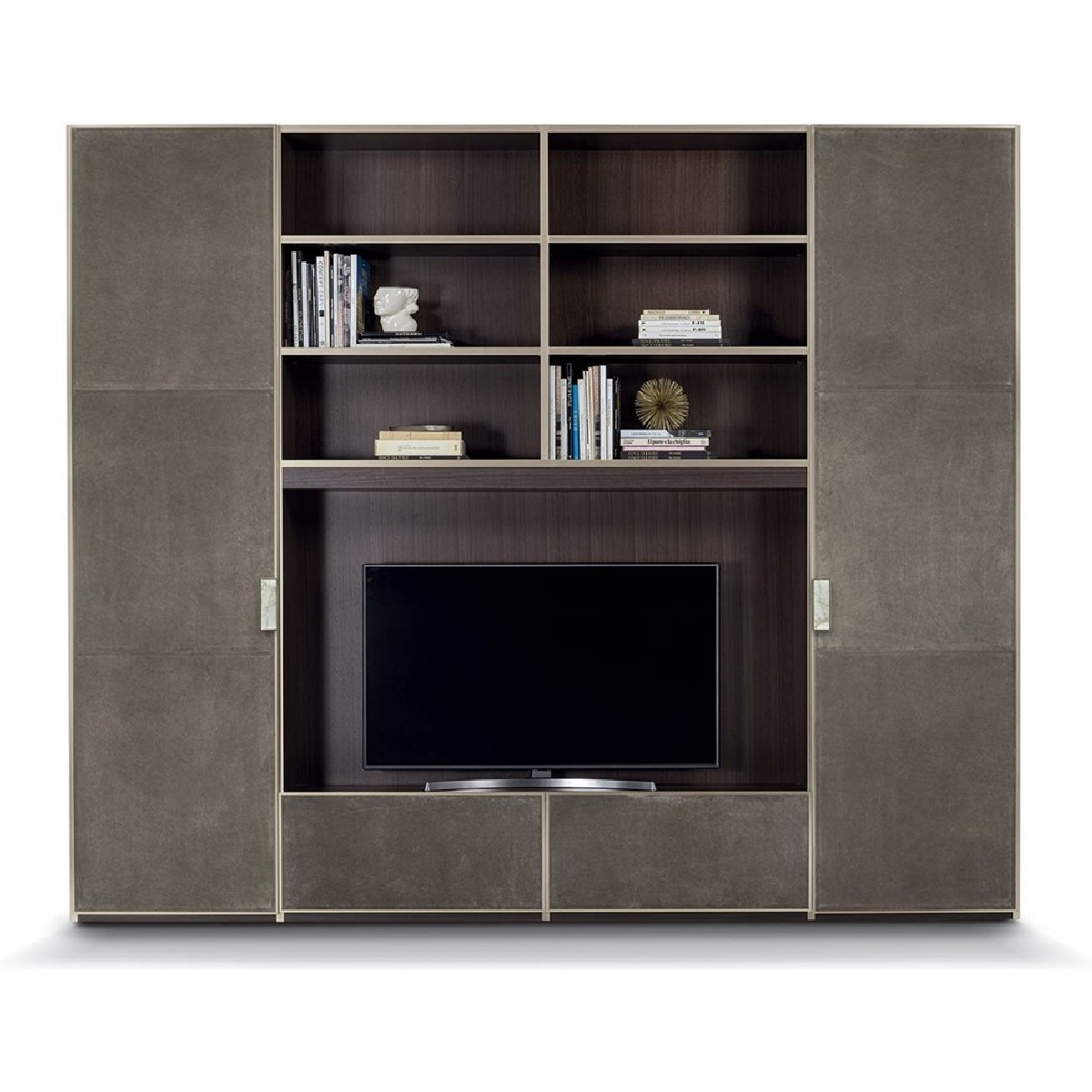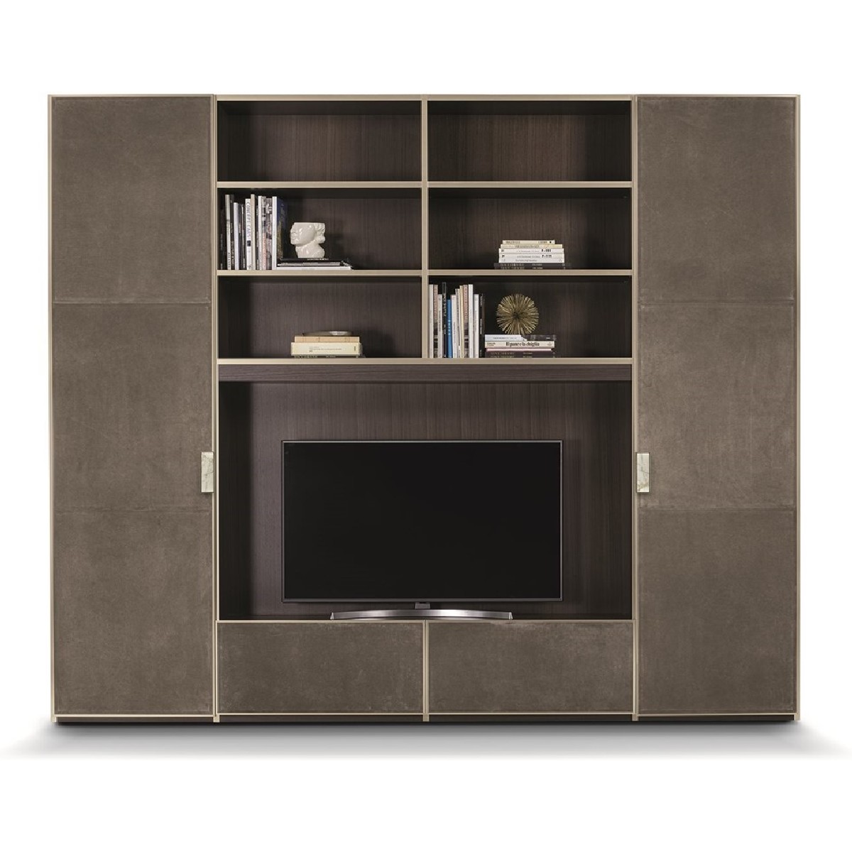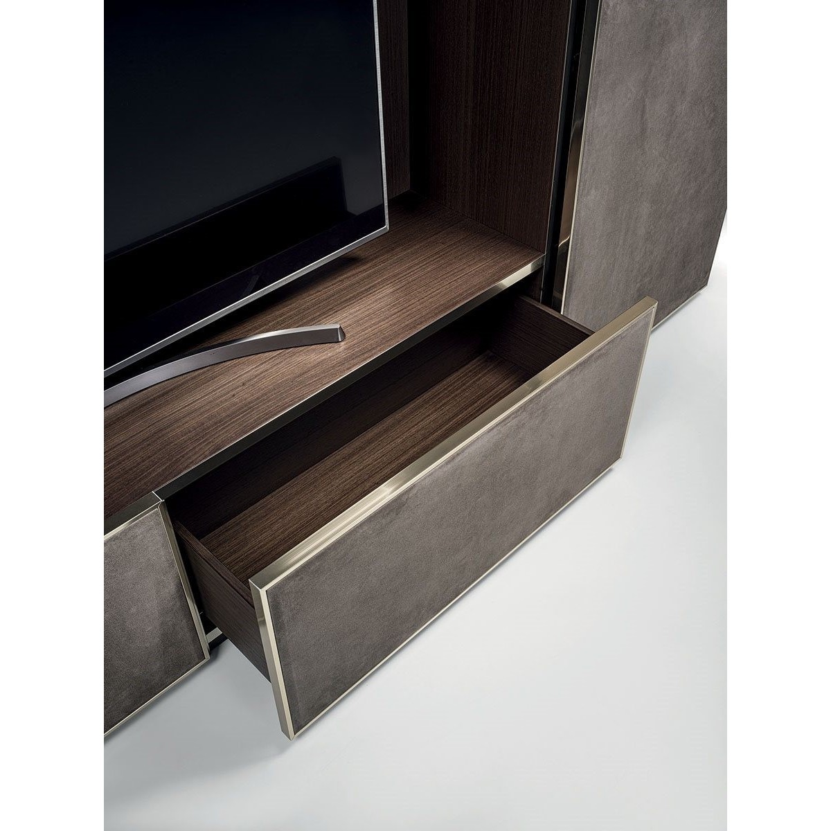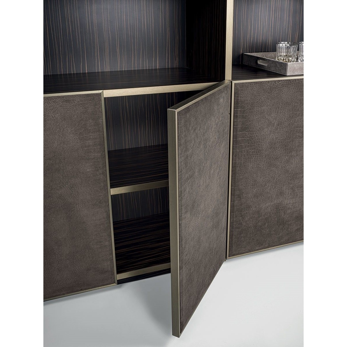 Ianus Middle is a modular system for building equipped partition walls with open compartments, chests of drawers, shelves and small doors that can be inserted to perfectly complete the modular nature of the boiserie panels and the doors. The structure is in veneered wood in the finishes: matt tinted Zebrano wood, matt Canaletto walnut, matt Newood Ebony or closed pore matt lacquer. Front edges of modules and door profiles are in anodized aluminium finishes, as follows: Matt Platinum, Matt satin bronze, Bright Aluminium, Bright Champagne Gold, Bright dark brown electrocolour. The shelves are in dark matt tinted Zebrano wood, matt Canaletto walnut, matt Newood Ebony, closed pore matt lacquer, covered in P.3 Cat. Suede or Tecsuede, or in natural, bronzed, or smoky 8 mm glass. Drawer fronts are covered in leather P.3 Cat. Suede or Tecsuede. Drawer interior bottoms are in wood or lined with leather P.3 Cat. Suede or Tecsuede. The side panels have LED lighting over their entire height. The system includes a special 180 cm module customizable for the TV. NOTE_the side panel includes an adjustable foot.
