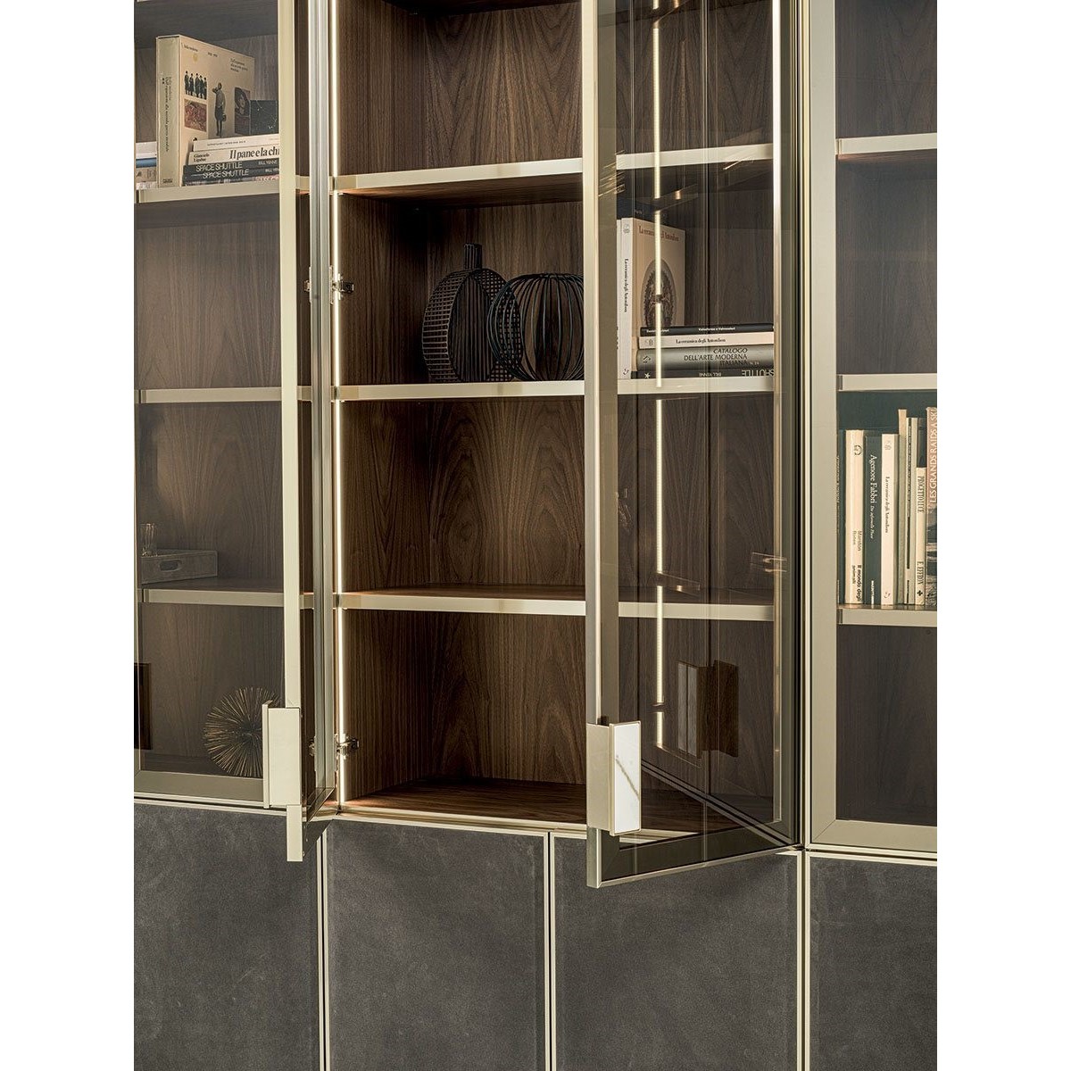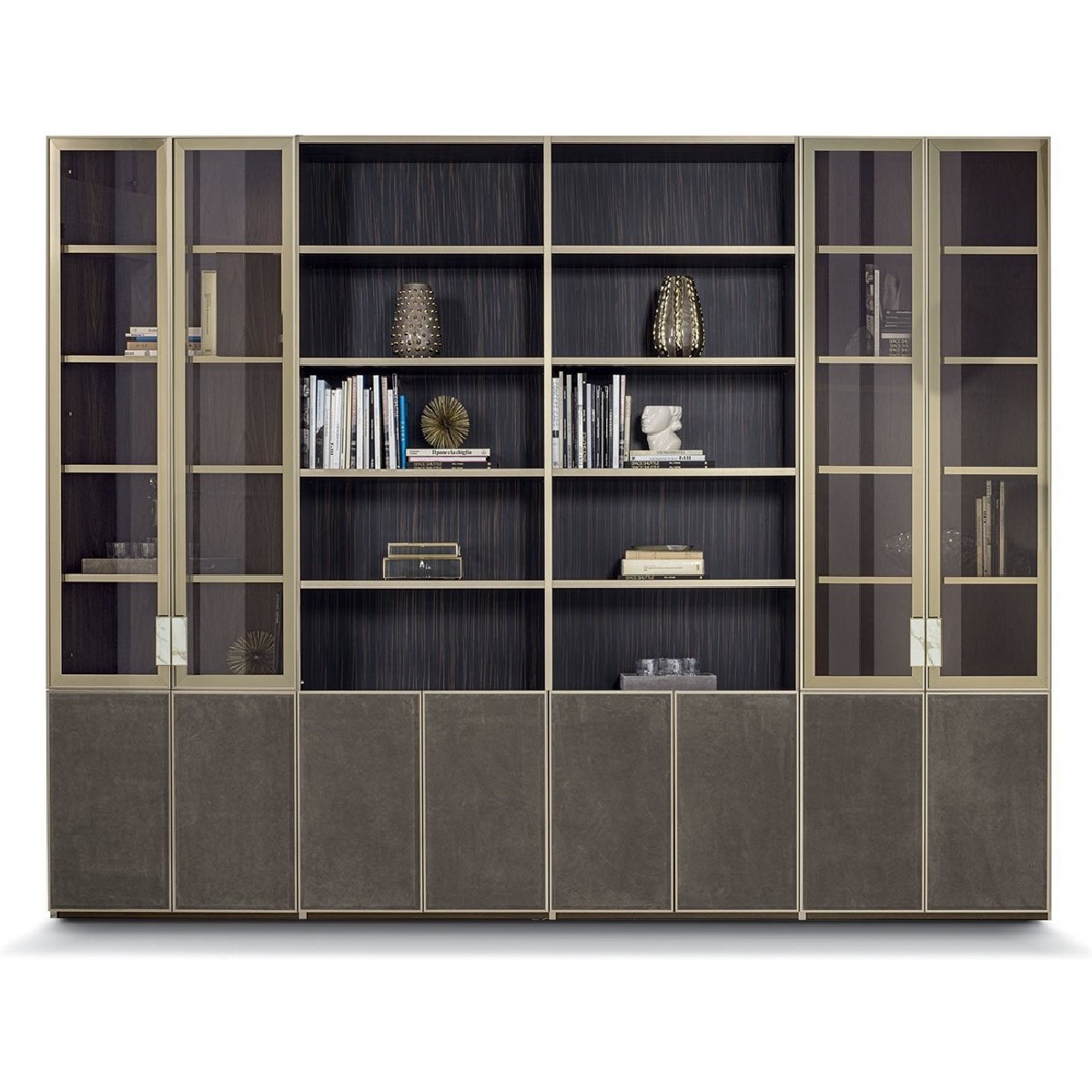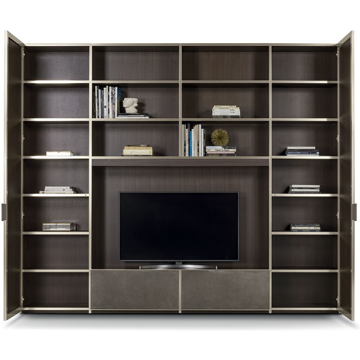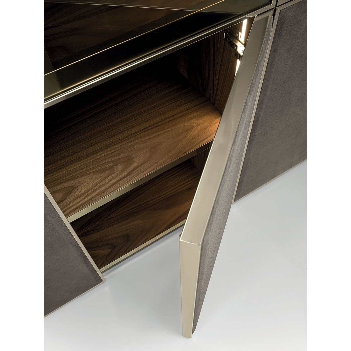 Ianus Middle is a modular system for building equipped partition walls with open compartments, chests of drawers, shelves and small doors that can be inserted to perfectly complete the modular nature of the boiserie panels and the doors. The structure is in veneered wood in the finishes: matt tinted Zebrano wood, matt Canaletto walnut, matt Newood Ebony or closed pore matt lacquer. Front edges of modules and door profiles are in anodized aluminium finishes, as follows: Matt Platinum, Matt satin bronze, Bright Aluminium, Bright Champagne Gold, Bright dark brown electrocolour. The shelves are in dark matt tinted Zebrano wood, matt Canaletto walnut, matt Newood Ebony, closed pore matt lacquer, covered in P.3 Cat. Suede or Tecsuede, or in natural, bronzed, or smoky 8 mm glass. Drawer fronts are covered in leather P.3 Cat. Suede or Tecsuede. Drawer interior bottoms are in wood or lined with leather P.3 Cat. Suede or Tecsuede. The side panels have LED lighting over their entire height. The system includes a special 180 cm module customizable for the TV. NOTE_the side panel includes an adjustable foot.
