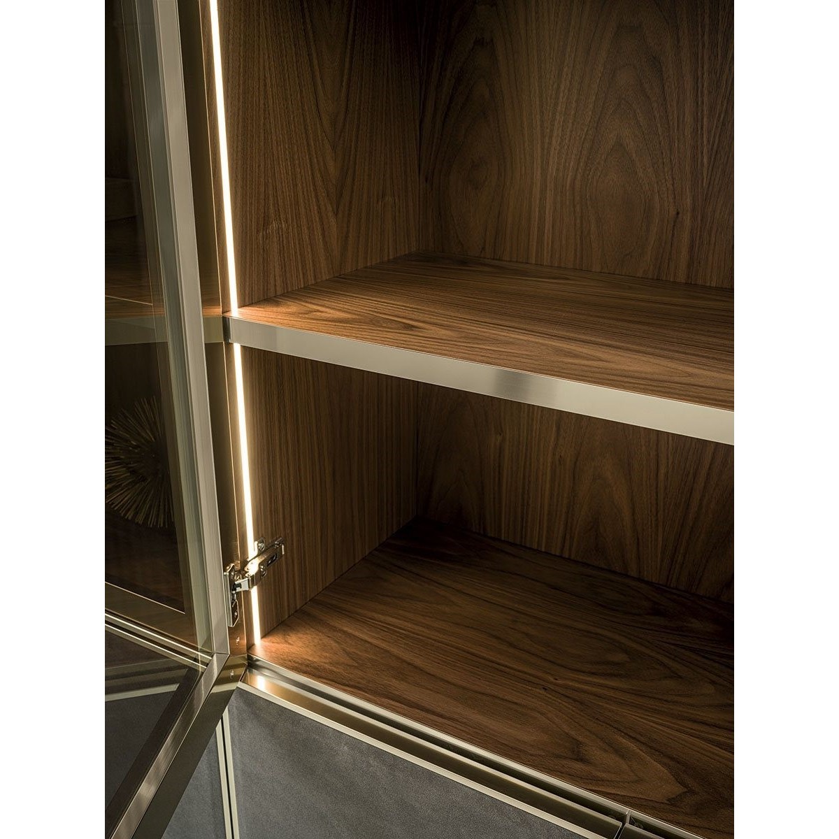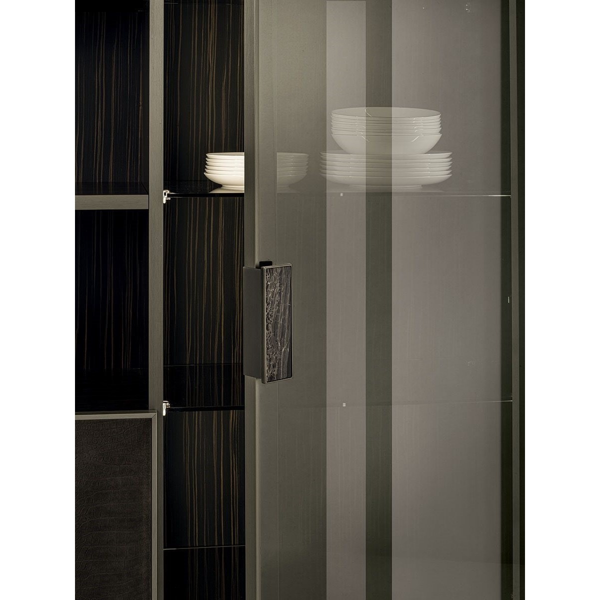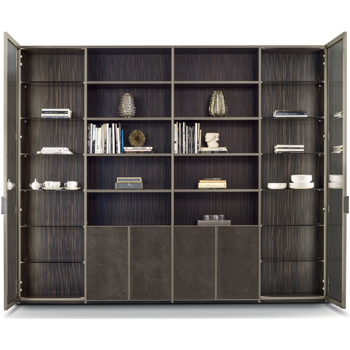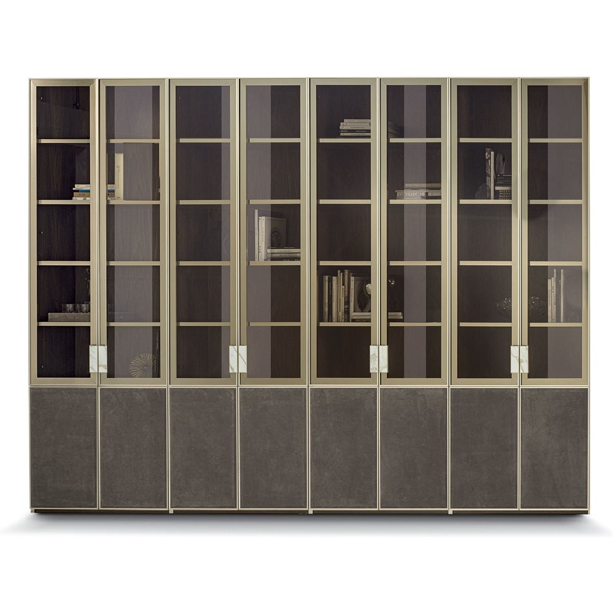 Ianus Middle is a modular system for building equipped partition walls with open compartments, chests of drawers, shelves and small doors that can be inserted to perfectly complete the modular nature of the boiserie panels and the doors. The structure is in veneered wood in the finishes: matt tinted Zebrano wood, matt Canaletto walnut, matt Newood Ebony or closed pore matt lacquer. Front edges of modules and door profiles are in anodized aluminium finishes, as follows: Matt Platinum, Matt satin bronze, Bright Aluminium, Bright Champagne Gold, Bright dark brown electrocolour. The shelves are in dark matt tinted Zebrano wood, matt Canaletto walnut, matt Newood Ebony, closed pore matt lacquer, covered in P.3 Cat. Suede or Tecsuede, or in natural, bronzed, or smoky 8 mm glass. Drawer fronts are covered in leather P.3 Cat. Suede or Tecsuede. Drawer interior bottoms are in wood or lined with leather P.3 Cat. Suede or Tecsuede. The side panels have LED lighting over their entire height. The system includes a special 180 cm module customizable for the TV. NOTE_the side panel includes an adjustable foot.